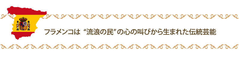 フラメンコは今でこそ華やかなイメージがありますが、元々はインド北西部が発祥ともいわれる“流浪の民”が、起源となり、東欧、南欧、スペインへと、西へ移動する中でその土地の音楽も取り入れながら、今のフラメンコの基礎が作られました。日々の生活の中で生まれる苦しみや悲しみ、時にはあふれ出る喜びを歌や踊りで表現したところから発生しています。 時代と共に、生活の中だけでなく、酒場やタブラオ(フラメンコを見ながら飲食ができる舞台付きの店)などでも披露されるようになりました。