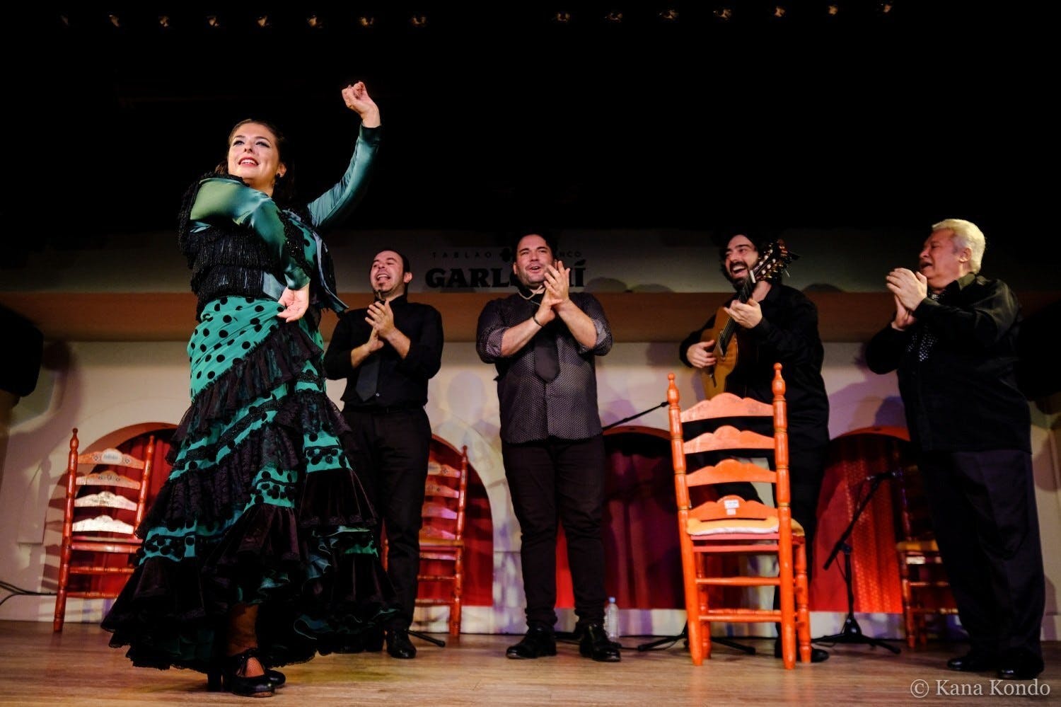 ギタリストが奏でるリズムに合わせて歌い手が自由に歌い、その歌に合わせて、踊り手が感じたままに表現する。時には踊り手が指揮者となって踊りながら合図を送り、ギタリストや歌い手を指揮する。このように演者同士が舞台でかけあいを楽しんでいるのです。