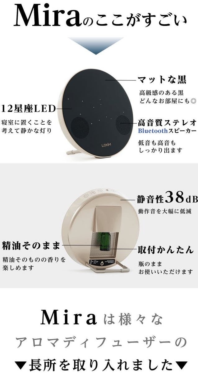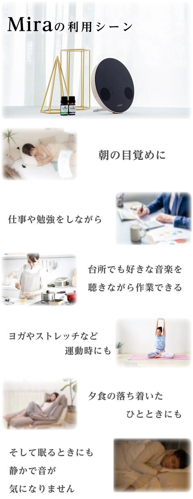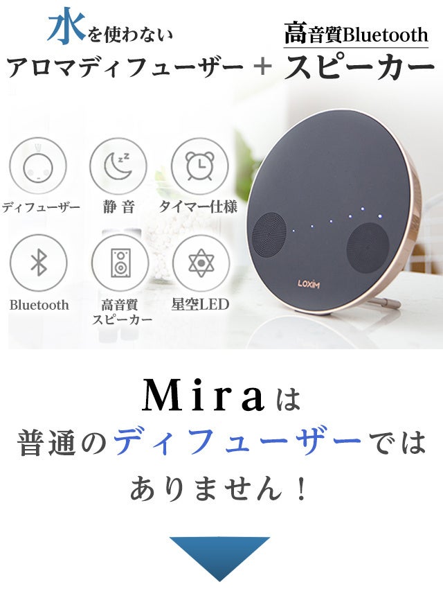 日々、Miraを使ってアロマテラピーと大好きな音楽を同時に楽しむことができると想像してみてください。きっと、あなたの心を癒すことでしょう。
