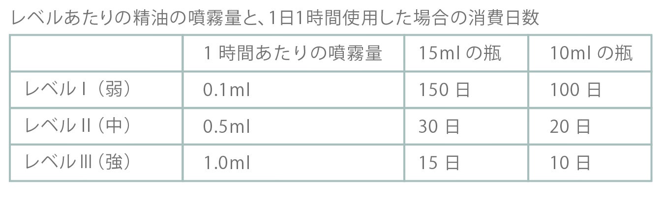 A:香りの感じ方については、個人差がある上、その部屋の形状や湿度、温度によって、拡散する広さは変わってきます。また、お使いの精油によっても香りの強さや、消えやすさ、も変わります。特に、柑橘系の香りは、香りが消えやすいです。加えて、人間の鼻は同じ匂いを嗅ぎ続けていると、だんだんと鈍くなるものです。このため、長く使い続けるのではなく、1時間使ったら休む、といったような使い方がおすすめです。
