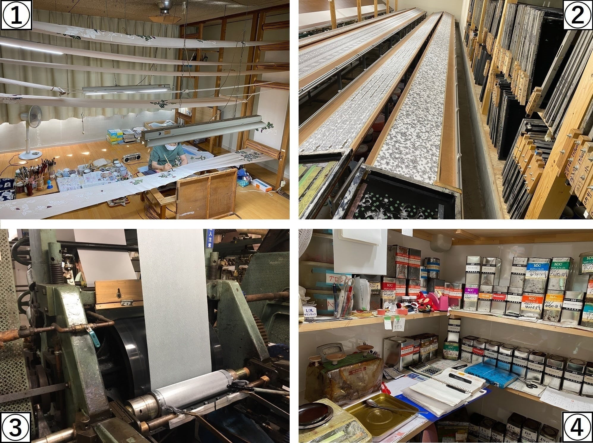 ①手描きの工房。職人が一つ一つの柄を手描きで描いて行くため、唯一無二の着物に なる。