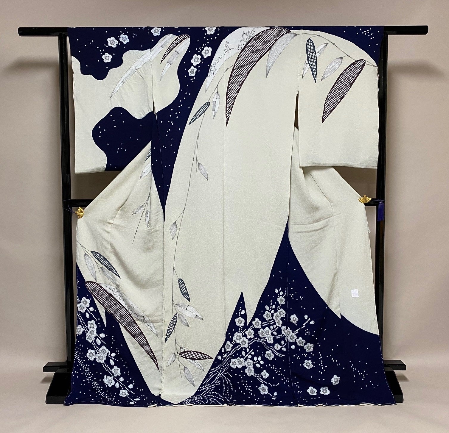 綸子地を黄色と紺に染め分け、紺地に鹿の子絞りで梅の木と花、霰、黄地には縫絞りと鹿の子絞り、手描きの絵で竹をえがいているほか、波や聞く、栗鼠が墨で描かれた豪華な訪問着です。