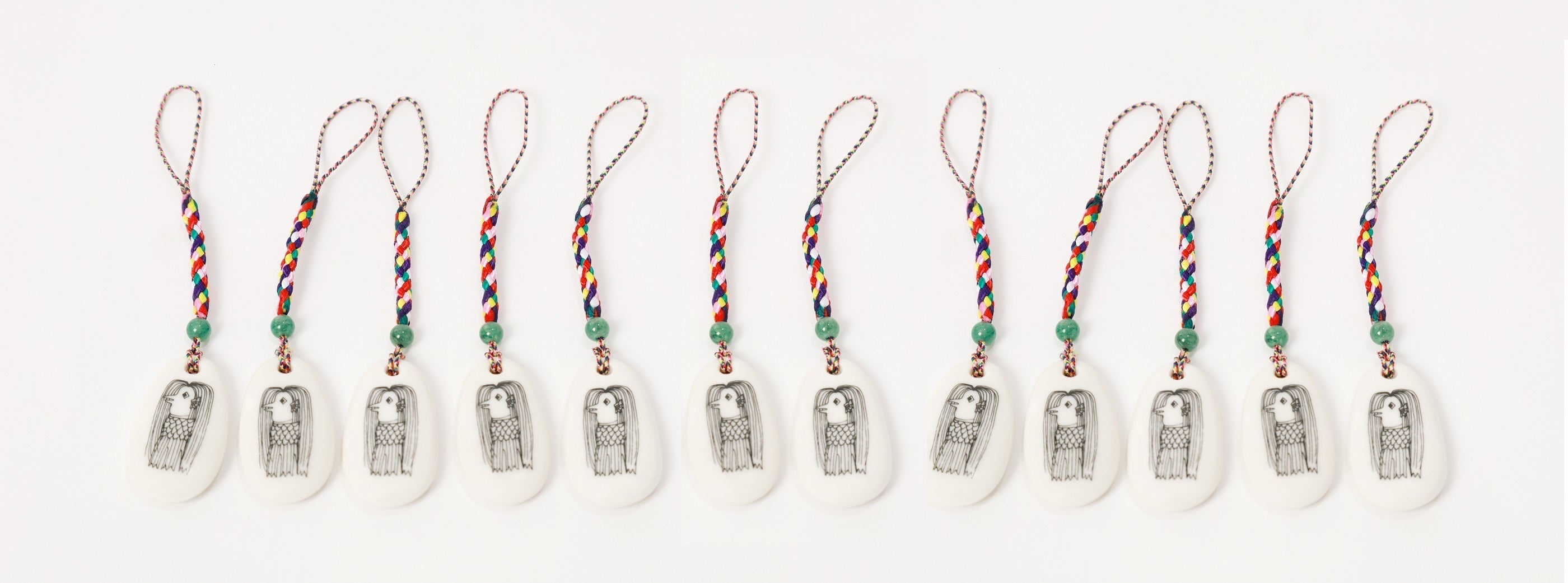 京焼の職人がすべて手作りで作り上げた磁器製の根付で、表面に「アマビエ」のイラストを描くとともに、裏面には魔除けの意味がある赤珊瑚色で邪気払いの梵字を配した根付で、厄除けの七色紐と五徳を高めると言われる翡翠を施しています。1230℃で素焼きするため、熱の当たり方で大きさや形が変わるほか、紐を通す穴も手作業で開けているため一つ一つ微妙に位置が異なるなど、完全に同一のものが存在しない唯一無二の品となっています。