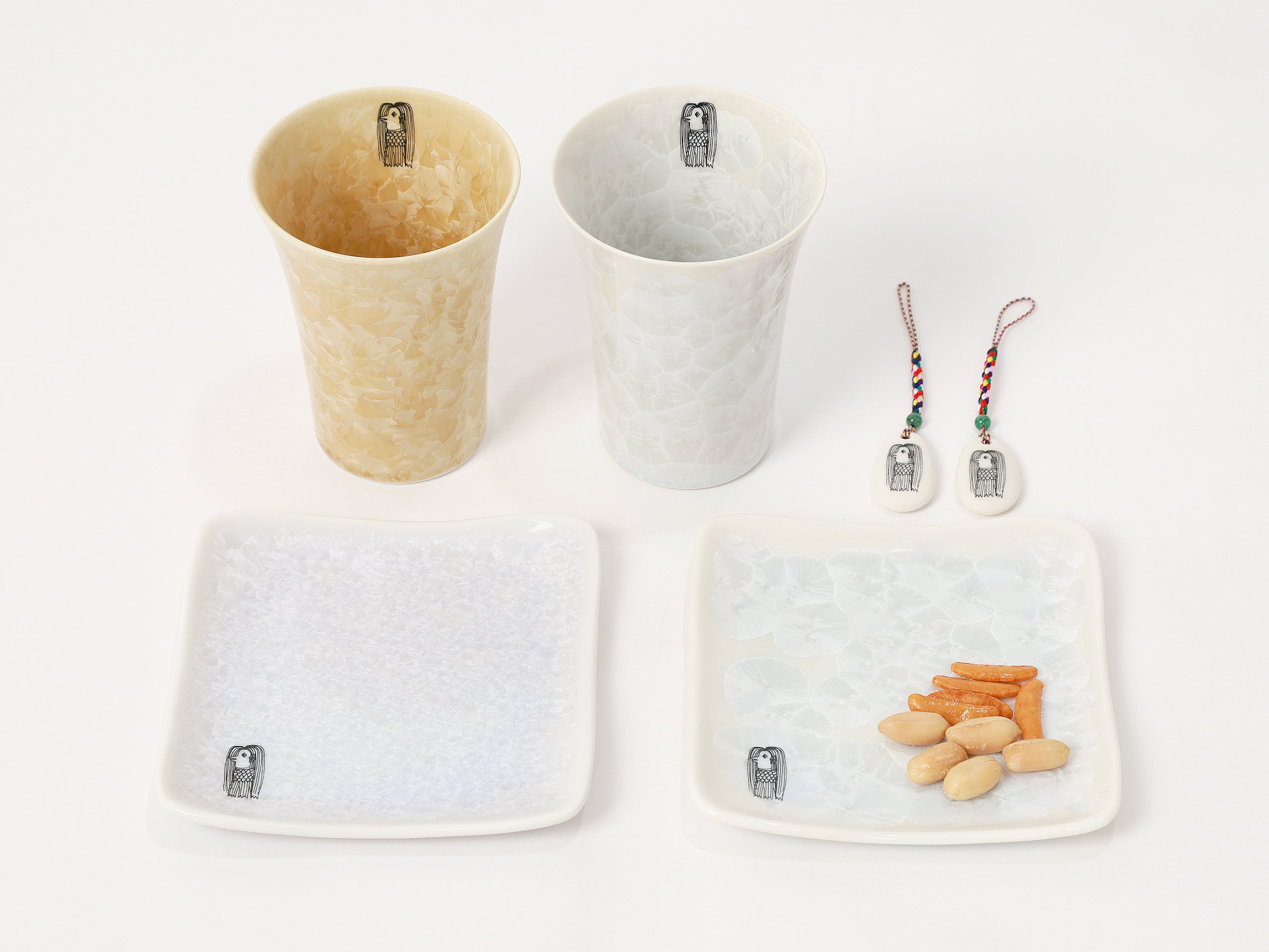 アマビエのカップと皿は、京焼・清水焼窯元 陶葊の多種多様な結晶の形が楽しめる花結晶(はなけっしょう)という独自の釉薬を使用した品です。釉薬が溶けて冷却する過程で結晶化する特性を活かし、の表面に、まるで花が咲いたかのよう美しい文様が浮かび上がらせています。2つとして同じ文様が出ないのが特徴で、多種多様な結晶の形を楽んで頂けます。