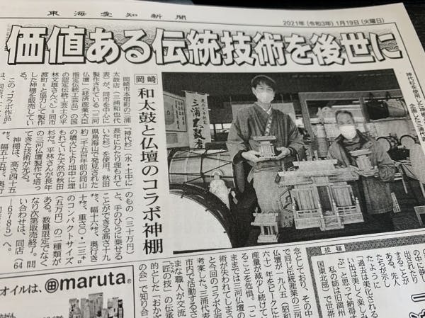 2021/02/07 13:21さて、先日『神代杉神棚』が新聞に取り上げていただきました♬今回の神棚は、私自身、ただ『神代杉』という貴重な素材を使って作ったモノというだけでは決してなくって、そこには、私が常々感じてきた『想い』があったので今回はそのことを少しお話しさせてください。そもそも、私が今回『三河仏壇宮殿師』である平林仏具の平林さんになぜ?神棚を作ってもらおうと思ったか、、、そこには、この日本がかかえる『伝統』と言うモノに対する大きな『課題』がありました。どういうことか?というと、早速ですが、みなさんに一つ質問です。みなさんのお宅に『神棚』はありますか?みなさんのお宅に『仏壇』はありますか?和室はあるでしょうか?床の間はあるでしょうか?それが、良いとか悪いということでは決してありません。それが『時代の流れ』である以上仕方のない事なのですが、生活様式やライフスタイルの変化というのは、ただそこに単なる『モノ』がなくなったということではない!という事を理解してほしいのです。そもそも、『神棚』や『仏壇』というのは何のためにあると思いますか?もちろん、『神様』『仏様』をお祀りするためにあるものではありますが、それが『日常生活』から失われることによって、意味することは何でしょうか?私は、単に生活習慣が変わることだけでなくそこにあった大切な『文化』ごと失ってしまう気がしているのです。それは『感謝の心』です。私には、大正12年生まれ今年、三回忌を迎えた今は亡き先代の婆ちゃんがおりました。ばあちゃんから私は人生で『大切な事』は何か?という事をその『背中』を通して教えてもらいました。ばあちゃんは、90歳をこえても毎日仏様を大切にしていて、庭に生えている『花』を積んではいつもきれいにお供えしていました。3年前に他界した大正12年生まれの太鼓屋ばあちゃん私は、ありがたいことに『商売』の家に生まれましたので、核家族化する現代においても、こうした『先人』の人たちの生き方、生き様を目の当たりにすることができたのです。神様仏様がいつもみているからな、お客様は姿が見えなくなるまでちゃんと頭をさげなあかんぞ、そして、ありがとう、ありがとう、だれに対しても分け隔てなく感謝を伝える『ありがとう』が婆ちゃんの口癖でした。変化することは、常でこのコロナ禍においてそれは『加速度』を増していると言われます。その一方でやはり、一つの『モノ』を失うというのは単にそれだけの事じゃない『文化』そのものを失う事と感じています。私達日本人というのは、昔から目に見えない大切な『心』を育む文化というのが『日常』にあったはずなのです。時代は、どんどん便利になります。時代は、どんどん変化します。その上で、本当に変化していいモノ、失ってはいけない大切なモノこれをきちんと見極められるかどうか?がまさしく、現代に生きる私たちに問われているのではないでしょうか?私自身、特にこの一年はひと言は言えない自分自身の『甘さ』が目立った気がしています。もう一度、大切な事を見つめ直しこれからも精進してまいります。令和三年二月吉日株式会社 三浦太鼓店 六代目彌市 もっと見る返礼品の発送について。