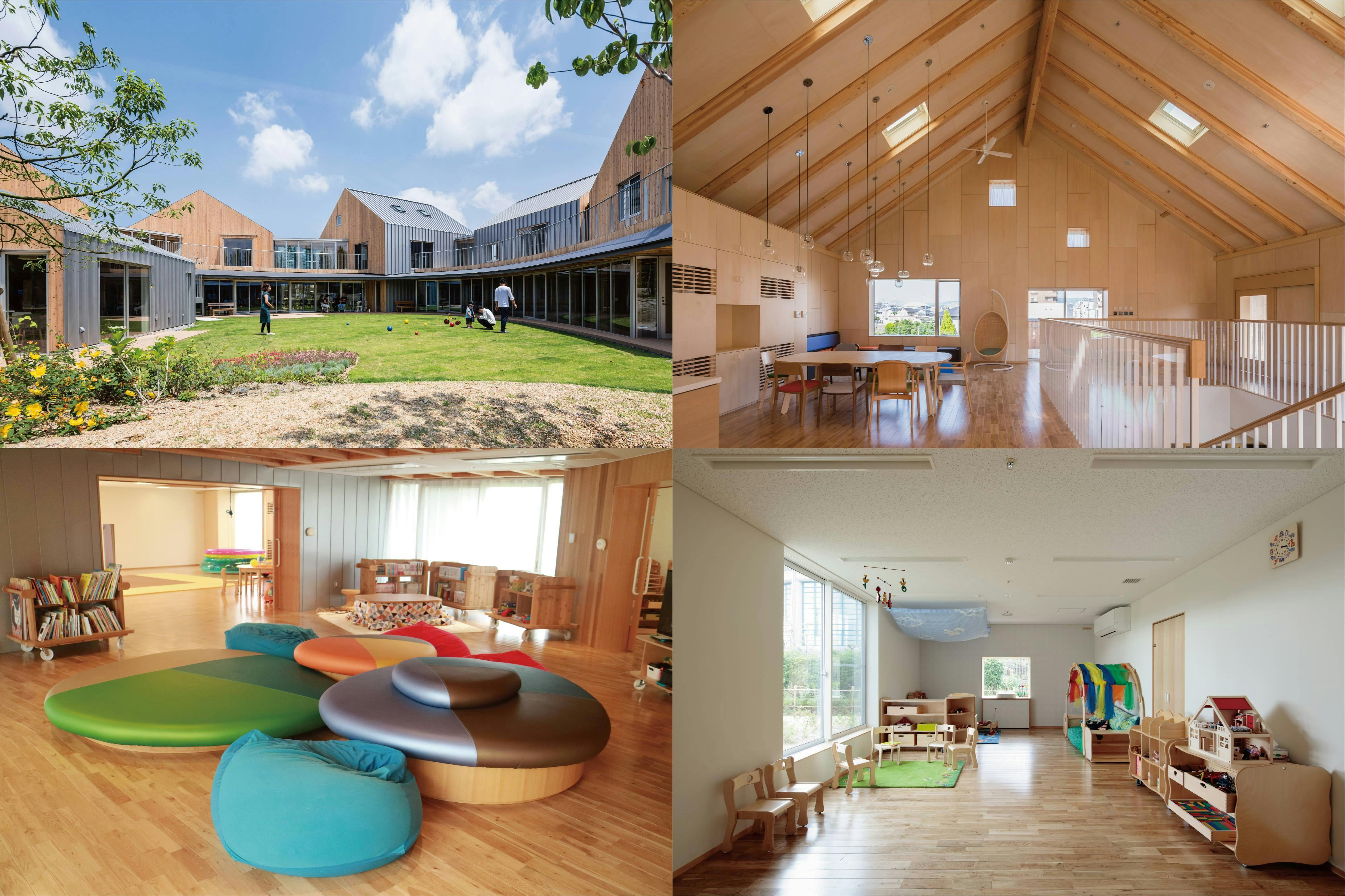 芝生の中庭を、6つの家が囲むように廊下で繋がっている子どもホスピス。この小さな村のような建物は、いろんな「わくわく」「安らぎ」「出会い」が生まれるようデザインされています。都市公園の中にあるので、とても緑豊かで折々の季節を感じることができます。