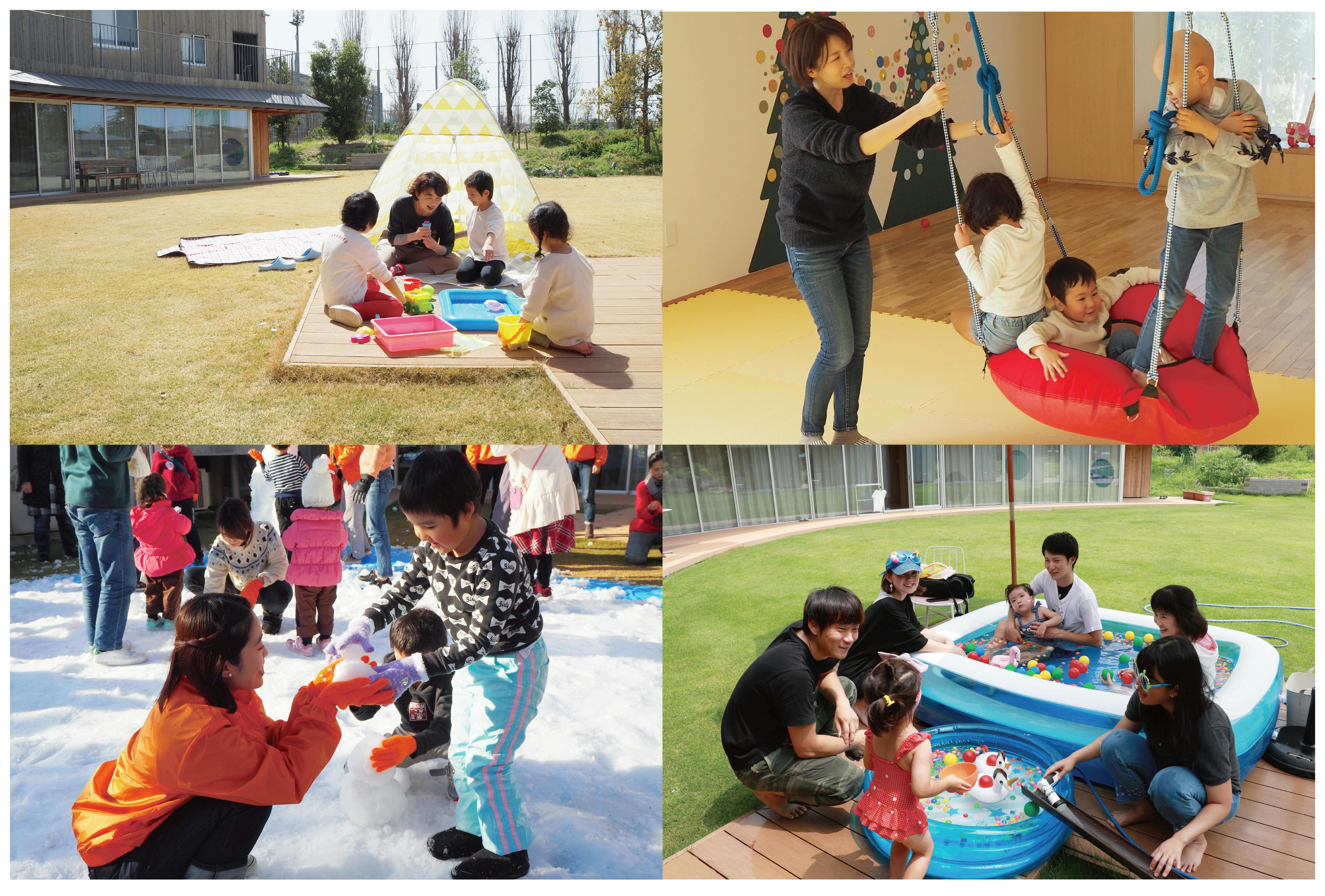 屋外では、中庭でピクニックをしたり、水遊びをしたり、原っぱで虫取りをしたり、鶴見緑地公園内の施設へお出かけしたり。年中楽しめる場がここにはあります。建物の中には、たくさんのおもちゃがある部屋、ブランコや遊具で遊べる部屋、ダイニングスペース、家族みんなで入れる大きなお風呂もあります。そして、病状を理解した看護師、保育士、療法士などの専門職が常駐し、家族が穏やかに過ごせ、苦悩を分かち合えるよう、子どもやきょうだい、保護者に寄り添います。ハウスキープやイベントを支えるボランティアも、子どもたちの成長を共に支えています。