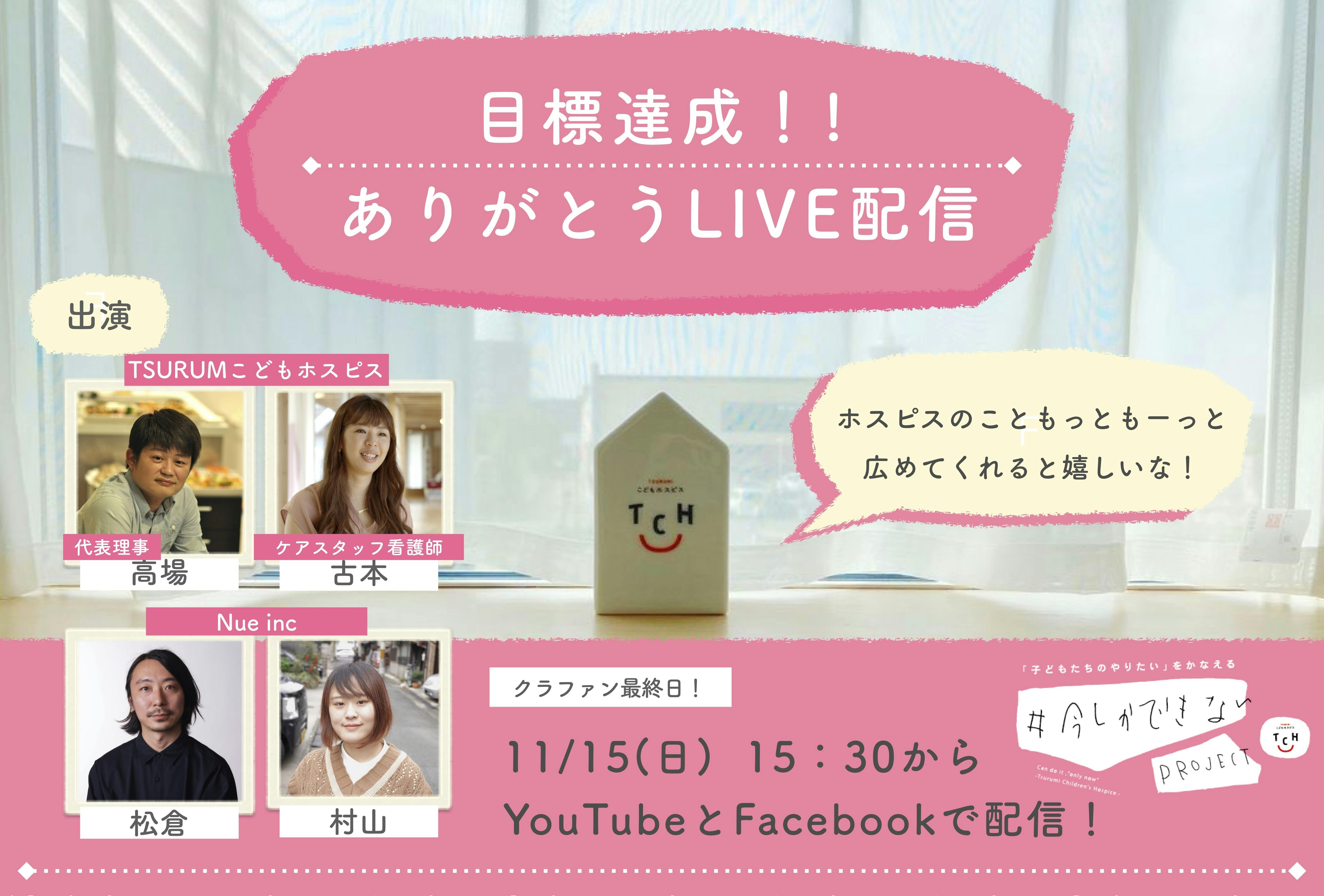 2020/11/14 09:23みなさま、こんにちは。今回、本プロジェクトを担当しておりますスタッフ(看護師)の古本です。いよいよこのプロジェクトも11月15日(日)の23:59をもって、終了となります!開始前は、いろんな不安(寄付してくださる人、いるのかな?)とドキドキの中で過ごしていた日々ですが、いざ始まると、ほんとに多くの方がご支援してくださり、感動と驚きの連続でした。毎日株価をチェックするかのように、「ご寄付が増えてる~」と嬉しくなっていました。このキャンペーン中、子ども達と過ごす中で「みんなの事を応援してくれている人がいるんだよ」の気持ちを強く持ちながら、子ども達に楽しい時間を過ごしてもらうため、スタッフみんなで頑張っていました。そしていよいよ最終日が来ます。今回のことの感謝の気持ちとこの期間に感じた事、日々子どもたちと接する中で思う事をお伝えいたしたく、初めてホスピスの事を知っていただいた方や今まで応援し続けてくださっている方に、ホスピスから初めてのLIVE配信を行う事にしました。一緒にプロジェクトを進めてくださったNue incのお二人も登場されます。応援する側からの思いもお話しいただけたらと。ぜひ、みなさん見ていただけると嬉しいです。日時:2020年11月15日(日)15:30 ~(1時間程度)https://www.facebook.com/childrenshospice.jp/live/https://youtu.be/-PSlInMFR-8出演者:こどものホスピスプロジェクト 代表理事 高場/TSURUMI こどもホスピス スタッフ 古本Nue inc 代表取締役 松倉 / ディレクター村山 もっと見る