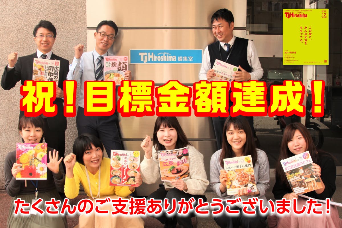 2020/11/10 00:00目標金額達成いたしましたーーーキタ━━━━(゚∀゚)━━━━!!ありがとうございました!本プロジェクトに支援していただいた皆さま、本当にありがとうございました!思い起こせば、流川エリア特集を企画したのは、非常事態宣言明け早々の6月頃。せっかく作るなら、2020年を記憶に残すような特別号を作りたい!そして、流川エリアを、広島の街を盛り上げたい!ということでした。しかし、制作費はどうする?その特集は本当に売れるの?という課題がでてきました。そこで、初めてクラウドファンディングにチャレンジするに至りました。このプロジェクトを通じて、支援いただいた皆さまの流川エリアを応援したい!広島在住じゃないけど頑張ってもらいたいなど、たくさんのあたたかいコメントをいただき、スタッフ一同大変うれしく、感動させていただいたと同時に、広島を愛する皆さまの気持ちを熱く感じました!TJ Hiroshima12月号の校了も間近となってきました。皆さまからいただいたご支援は大切に使わせていただきます!返礼品も順次発送させていただきますので、楽しみにお待ちください。この度はご支援本当にありがとうございました!TJ Hiroshima編集室一同 もっと見る