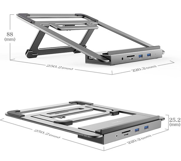 この【ドッキングスタンド】は13個のコネクタを搭載したアルミ合金のPCスタンド。