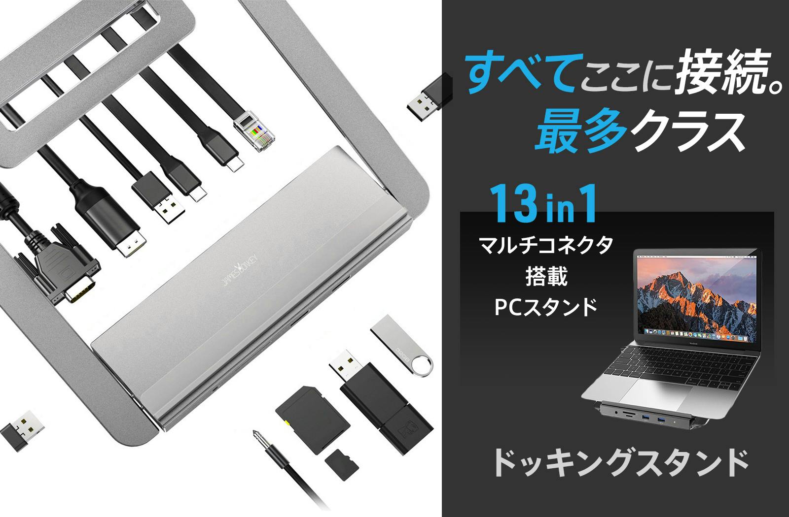 この【ドッキングスタンド】は高速データ通信対応のUSB3.0をはじめSDスロット、PD、4K HDMI 、1080P VGAなど各種デバイスで使われる13個のコネクタを一堂に搭載。