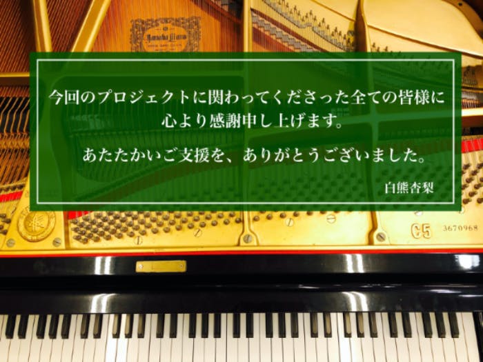 2021/01/13 17:02今回のプロジェクトに関わって下さった皆さまへこの度は、本プロジェクトへのご支援ご協力を頂きましてありがとうございました。プロジェクト達成のご報告とお礼、今後について(リターン発送について)をお話しさせて頂きたいと思います。長くなりますが、最後までお読みください。◯プロジェクト達成のご報告2020年11月29日から公開した本プロジェクト。一昨日最終日の2021年1月11日に目標金額を達成し、プロジェクトを成功させることができました。*目標金額¥1,500,000→支援総額¥1,507,500*支援者数:56人◯ご支援くださった皆さま、応援して頂いた皆さまへのお礼重ね重ねになりますが、今回のプロジェクトにご協力を頂きました皆さまに心より感謝申し上げます。たくさんの方からあたたかいご支援を頂き、本当に感謝の気持ちでいっぱいです。地元千葉でお世話になっていた方から数年ぶりにご連絡を頂き、小学・中時時代の同級生や同級生のお母さまお父さまからあたたかいメッセージを頂いたり、仕事やプライベートでお世話になってる方からも応援を頂き、ご面識がないにも関わらず、メッセージやあたたかいご支援を頂いたり、朝生先生の門下生ともつながることが出来たり。プロジェクトを達成できた事はもちろんですが、今回の事を通してたくさんの方と繋がれたことも本当に嬉しく思っております。そして嬉しく思うのと同時に、こんなにもたくさんの方が私が立ち上げたプロジェクトのためにご協力下さったのだと、身が引き締まる思いでおります。クラウドファンディングの返礼は当たり前のことですが、今後、長い長い人生の中でいつか必ず、何かしらの形で皆さまへお礼が出来るよう、日々努めて参りたいと思っております。この度は、あたたかいご支援ご協力を頂きましてありがとうございました。今回のプロジェクトに関わって下さった全ての皆さまに感謝申し上げます。◯リターンについてプロジェクトが無事に終了し、現在リターン作成の準備を始めているところであります。以前もご連絡をさせて頂いたかと思いますが、オーバーホールの作業状況により当初予定していた時期よりもリターンの発送が遅くなります。何卒、ご理解賜りますようお願い申し上げます。今後のスケジュールは下記の通りです。※また、変更となる場合があルカもしれませんがその都度ご報告させて頂きます。〈今後のスケジュール〉2月中旬:スタジオからオーバーホールを依頼した工房にグランドピアノを搬出、搬入3月上旬:オーバーホール作業開始5月上旬:オーバーホール作業終了→工房からスタジオに搬出、搬入5月中旬(搬入が終わり次第):演奏動画収録・ハンマーキーホルダー作成・ポストカードを作成6月中:6月中に皆さまのもとに到着するよう、発送致します。オーバーホールは担当してくださる技術者により、ピアノの音色の違いや作業料金が変わることがあり、オーバーホールをお任せする業者を決定するまでに時間がかかってしまいました。その関係でリターンの到着が予定していた時期よりも大幅に遅くなってしまいました。何卒、ご容赦ください。私自身もオーバーホールは初めての経験で、オーバーホール後の恩師のピアノがどのような音を響かせてくれるのか、とても楽しみにしております。リターンの到着までしばらくの間お待ちください。◯最後に(※今の自分の気持ちを忘れないために書いた文章です。わかりにくい部分や正しくない表現等が多々あると思いますが...ご了承ください!)「大好きだった恩師のグランドピアノをなおしたい」という思いから立ち上げた今回のプロジェクト。プロジェクトを進めていく中で、プロジェクトを達成することが目的ではなく、「オーバーホールした恩師のピアノが、たくさんの方に弾き継がれていくこと」、これが今回の企画の最大の目的で、恩師への恩返しになるのではないかと思うようになりました。まずは無事にオーバーホールできることが決まったことを、朝生先生が喜んでくださっていたら嬉しいです。そして、今回の企画に協力をして下さった皆さま、私に関わって下さっている全ての方々へ、「感謝の気持ちを忘れず」、「今のこの気持ちを忘れず」、「日々努力し続けること」。当たり前のことではありますが今回の企画を通して、私のこれからの人生の、最大の課題を見つけることが出来ました。 もっと見る