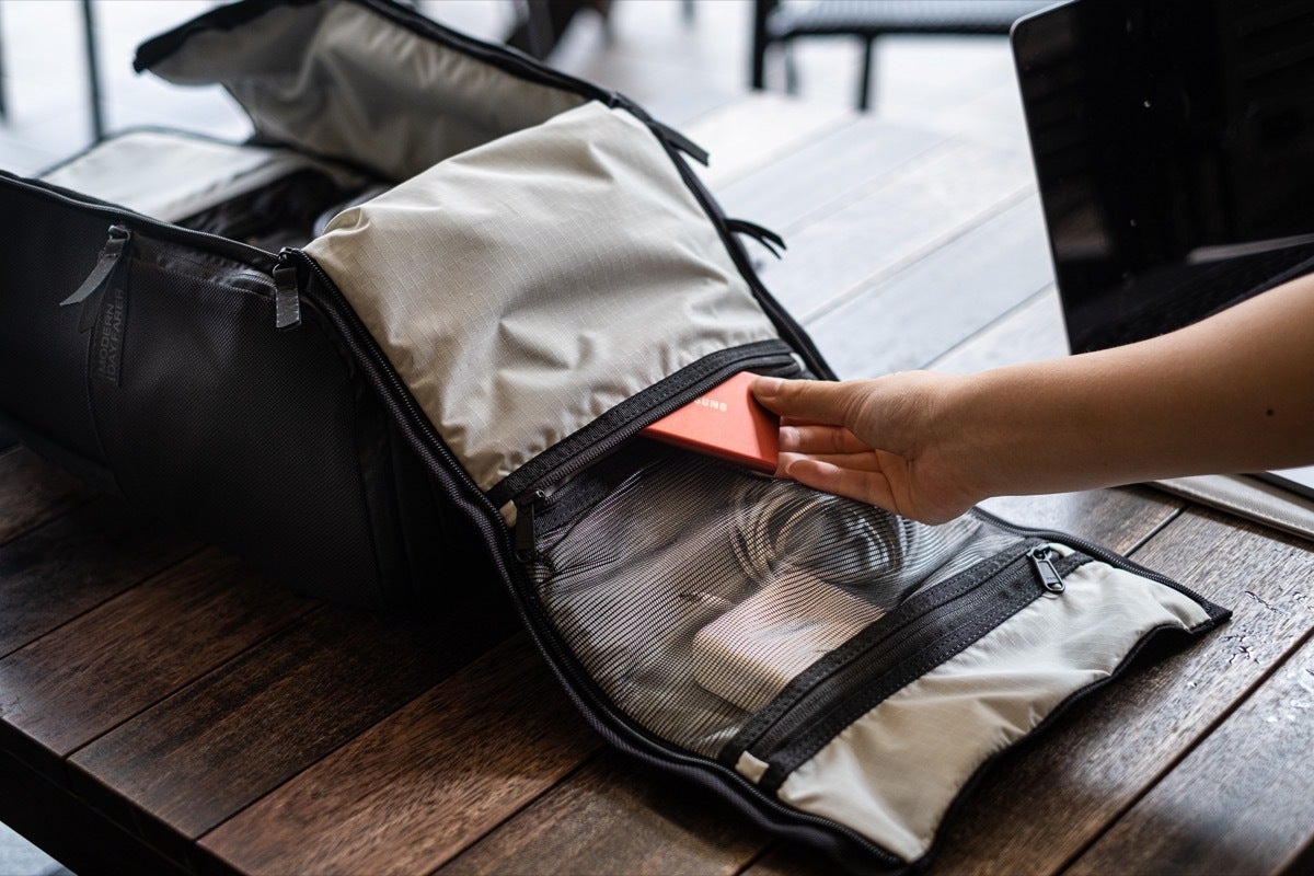 テックポーチ:充電器やケーブルなどハイテクガジェットを収納。DAYFARERバックパックのメインコンパートメント、フロントポケットに収納可能。