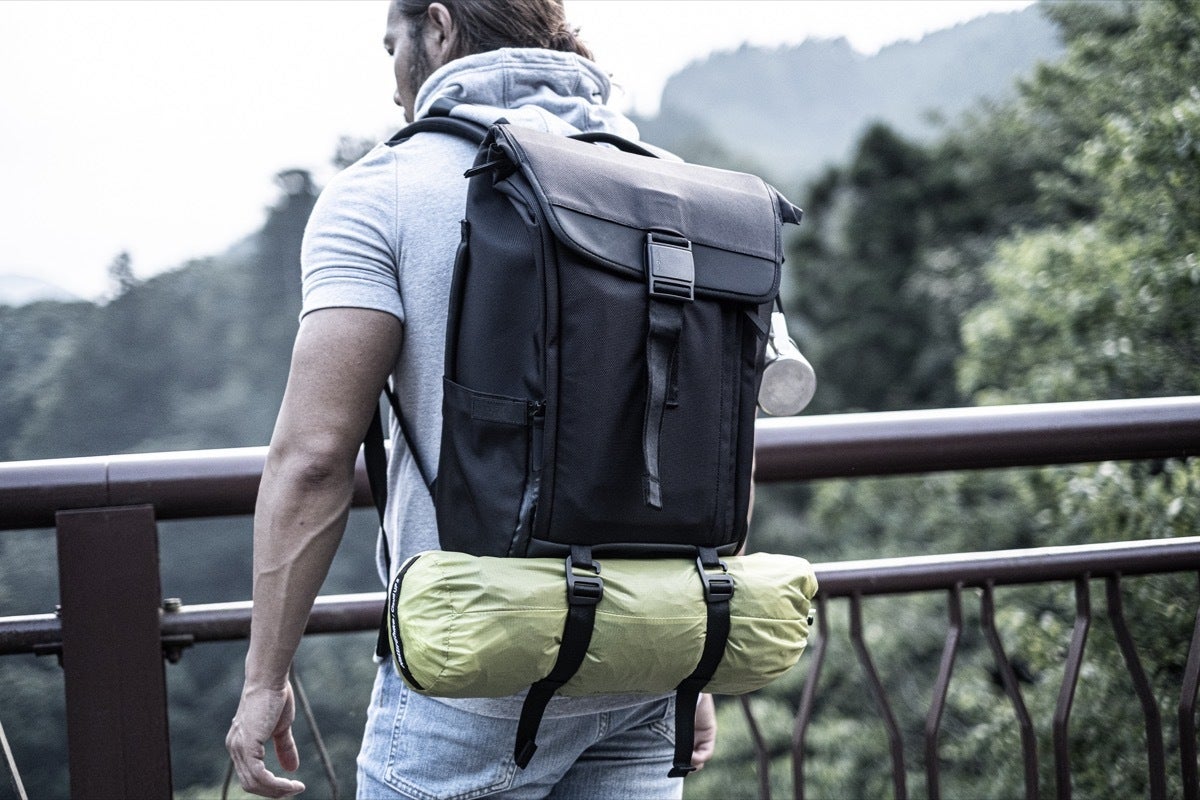 アクセサリーストラップ:DAYFARERバックパックのボトムに取り付けて、三脚やキャンプ用マットを装着できる。