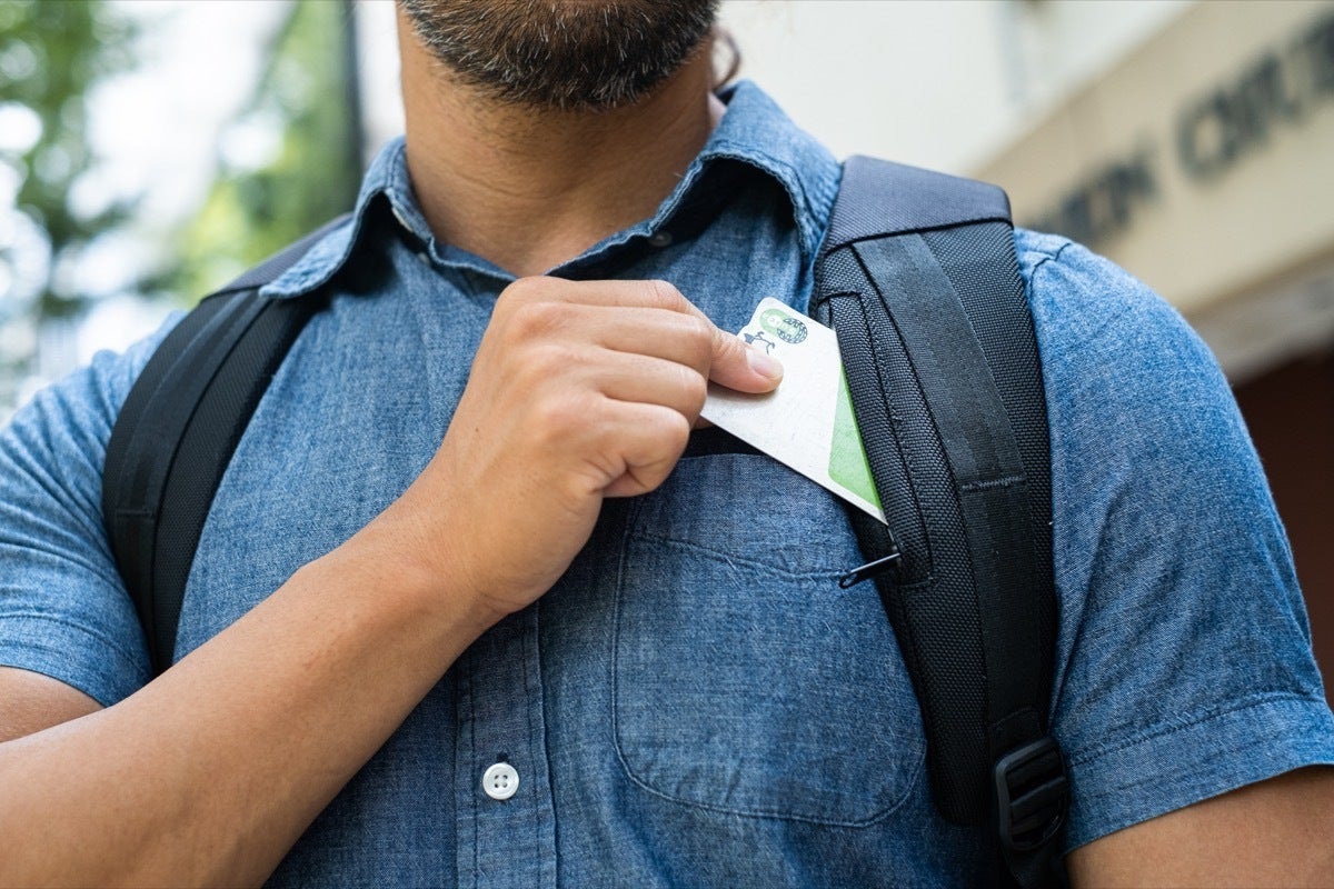 背中側にある隠しポケットに、パスポートなどの貴重品を収納可能。