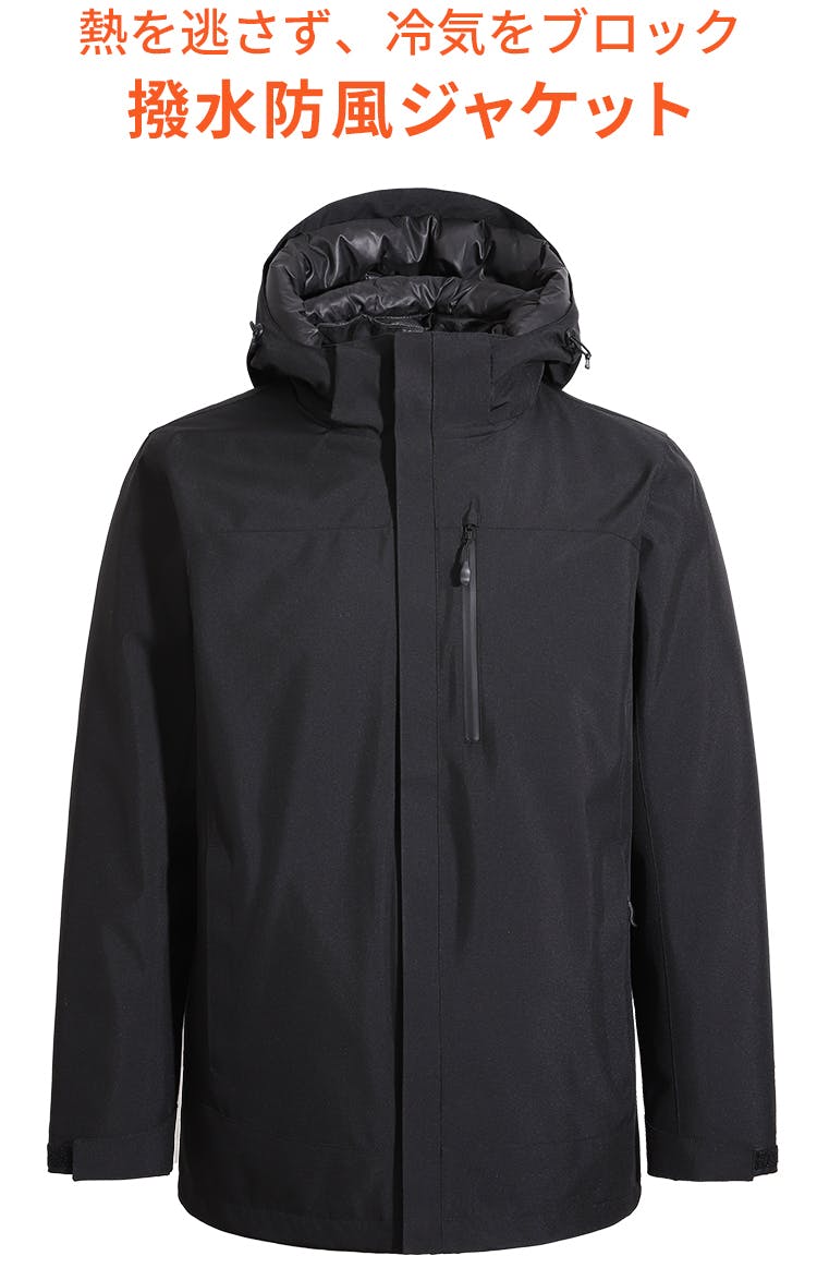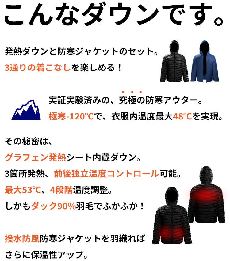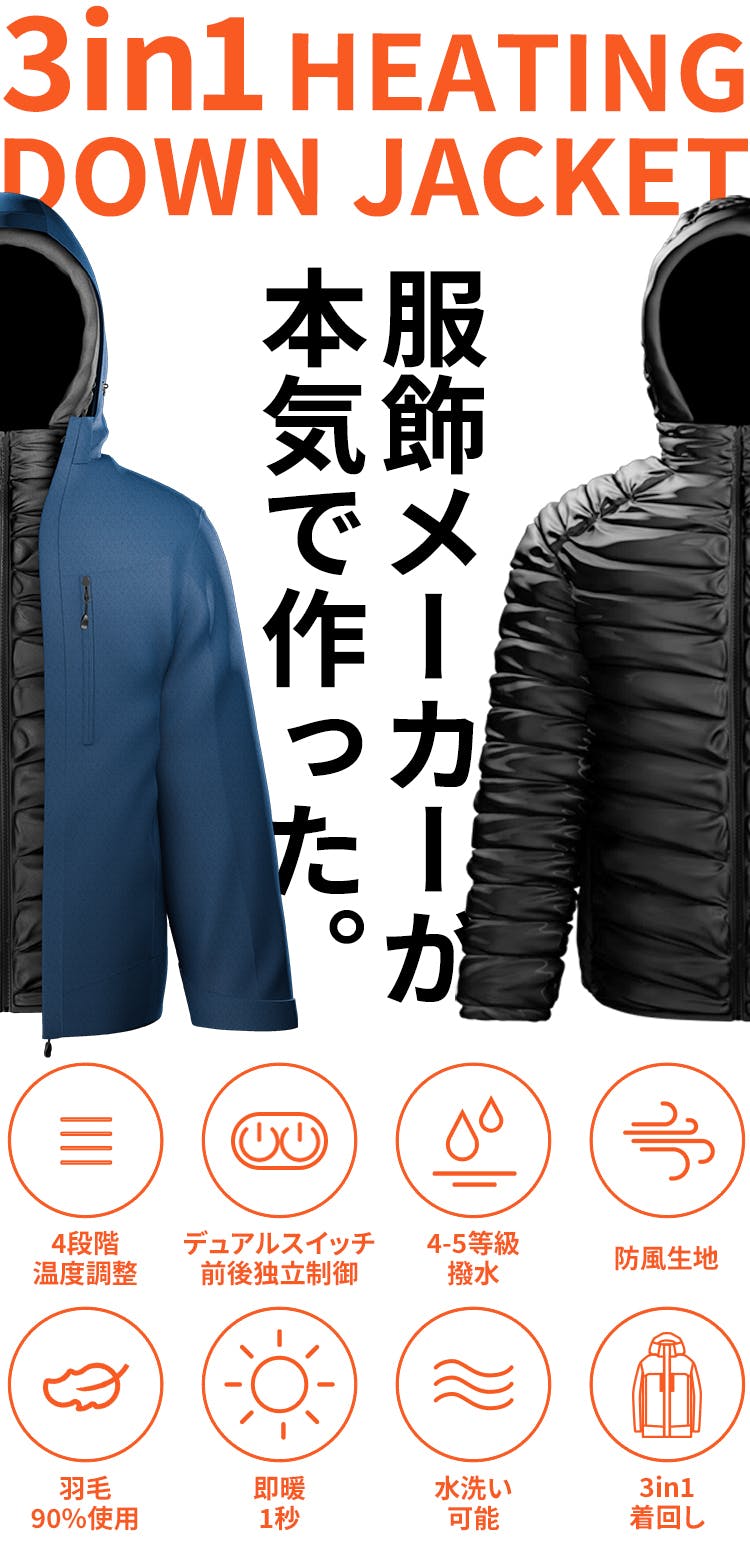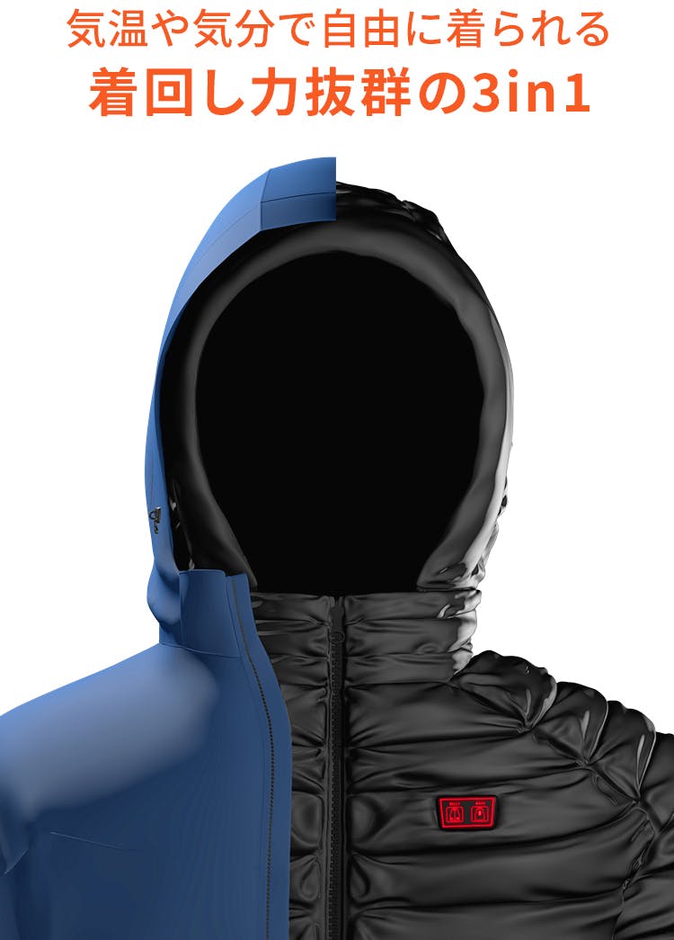 発熱ダウンとジャケットを重ねたデザインの3in1発熱ダウン。3通りの着回しが楽しめる優れものです。