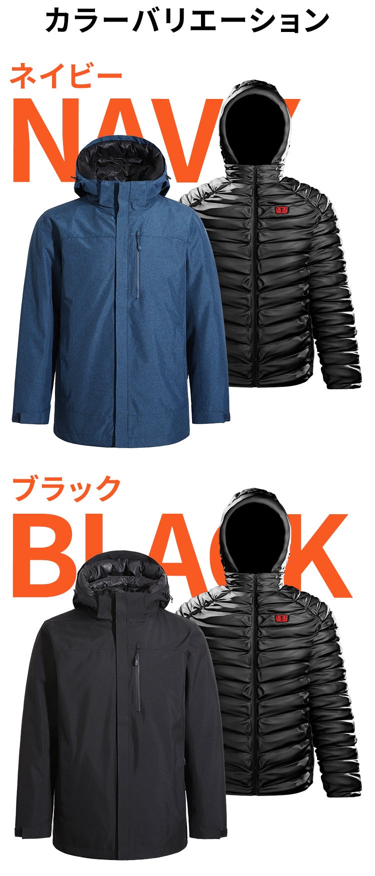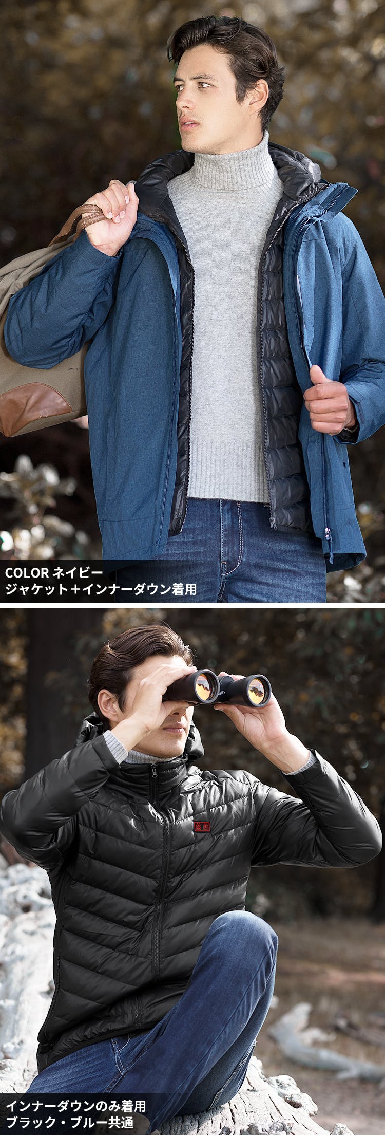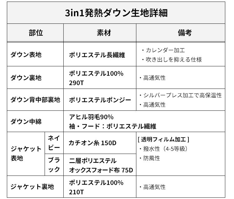 発熱ダウンとジャケットを重ねたデザインの3in1発熱ダウン。3通りの着回しが楽しめる優れものです。