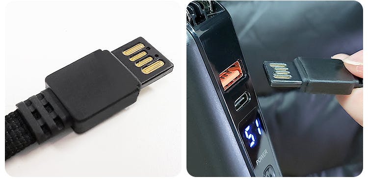 発熱ダウンは、手軽に給電出来る、モバイルバッテリー給電式。ダウンのポケットに内蔵されている専用のUSBケーブルに、モバイルバッテリーを接続頂くと、加熱が開始します。