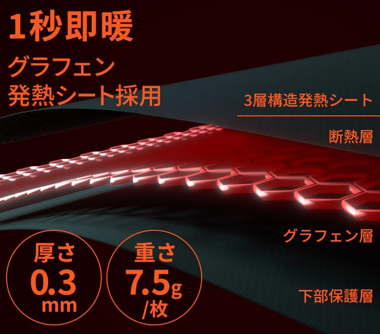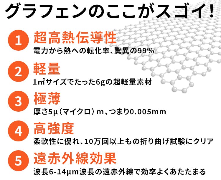 発熱シートの素材には、現在、様々な分野で注目を集めるナノカーボン素材、グラフェンが使われています。ナノサイズの炭素物質で、胴と同等程度の優れた熱伝導性を有するグラフェン。