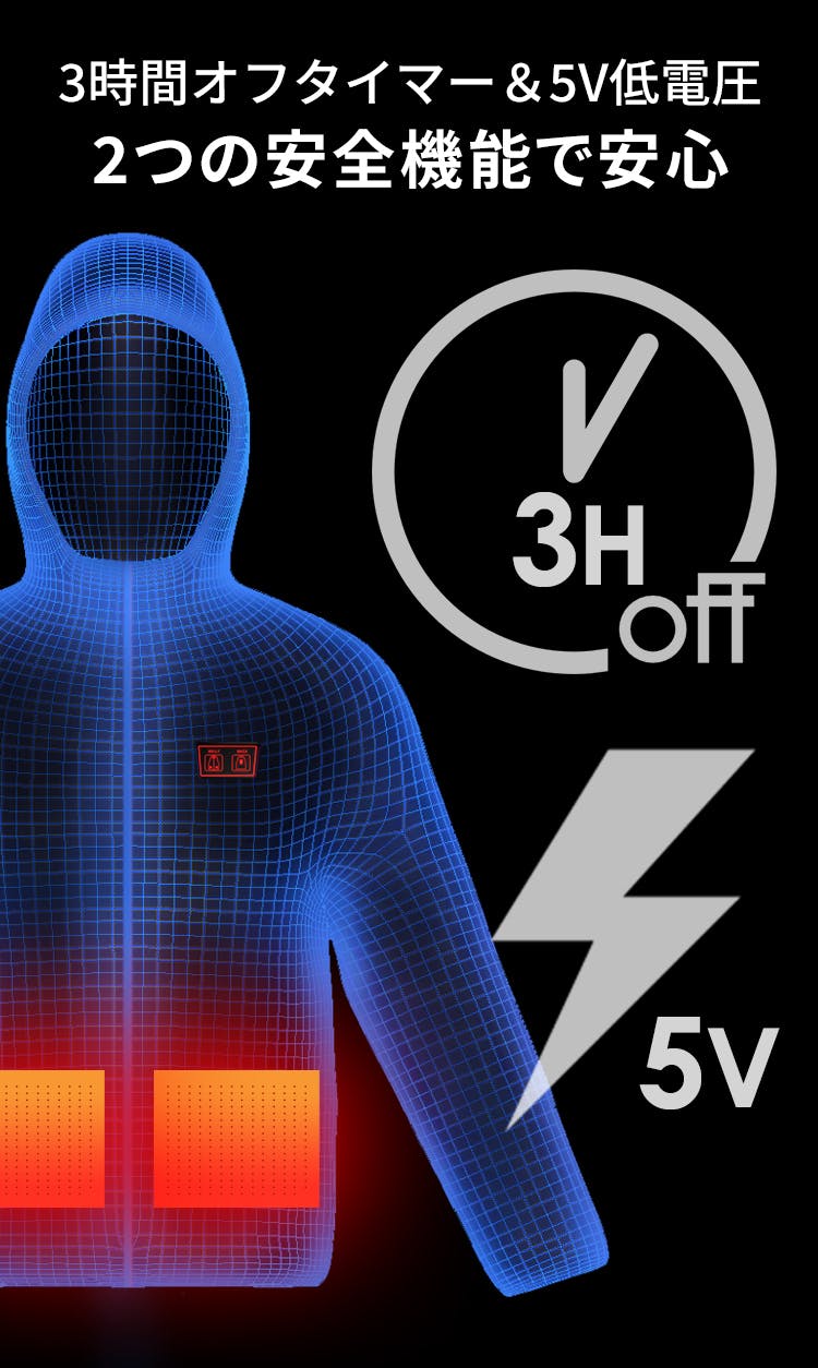 さらに、世界の安全基準である20~36Vを下回る、5V低電圧設計。万が一の感電リスクから、人体を守ります。