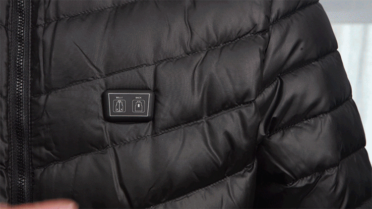 前後の発熱シートは、胸元のボタンで別々に制御できます。例えば、前はオフにして、背中だけ暖める、なんて使い方も可能。