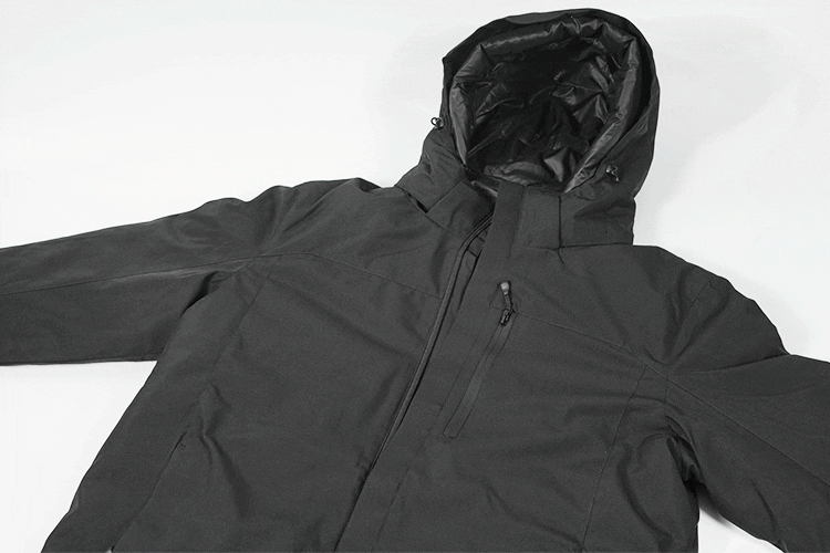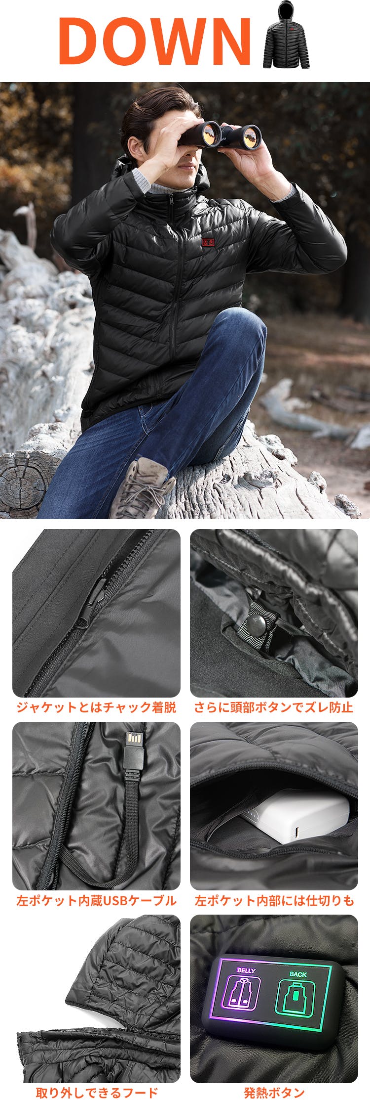 発熱ダウンとジャケットは、左右サイドのチャックでしっかりと固定します。さらに、首元のボタン、フードのボタンでズレを防止。モバイルバッテリーと接続するためのUSBケーブルは、左ポケットに内蔵されています。