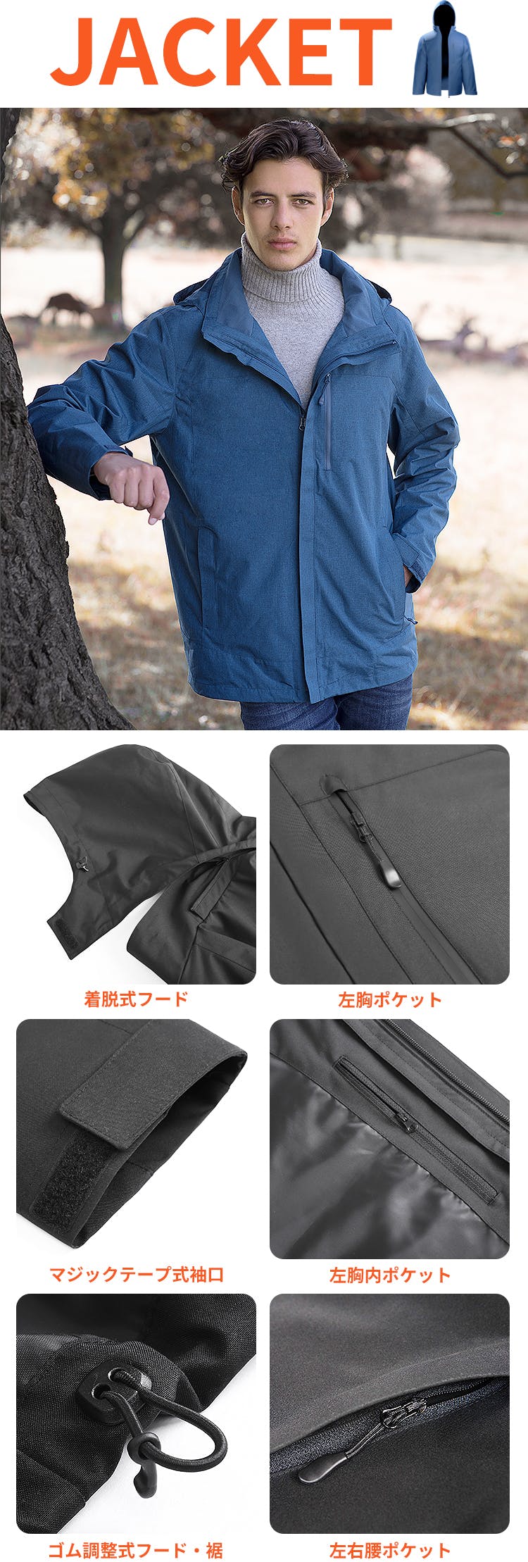 ジャケットには、内外計4つのポケット付き。どれも、水が浸入しにくい防水仕様のチャック式ポケットなので、貴重品の保管にも最適です。ゴムベルトや、マジックテープで、袖口、裾、首元の締まりを調整でき、冷気の侵入を防止します。
