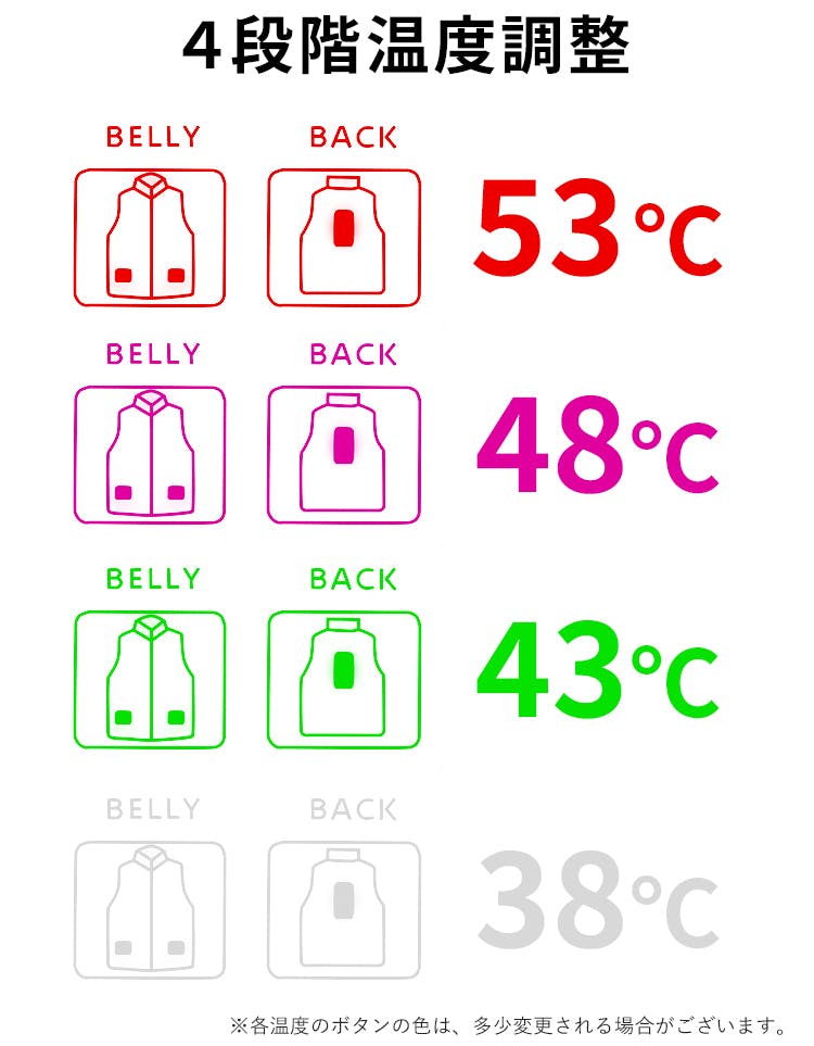 胸元のボタンの色で、温度設定が一目瞭然!例えば前後で異なる温度設定にした場合は、左右でライトの色が変わりますよ♪