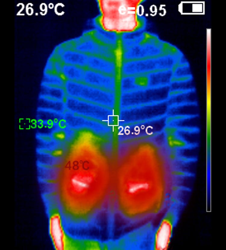 マイナス10℃の環境で、発熱ダウンを着用した実際のサーモグラフィーデータです。前後のグラフェン発熱シートを48℃に設定した場合、赤色:48℃、緑色:33.9℃、青色:26.9℃が記録されました。