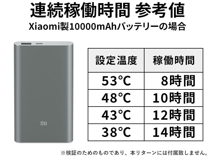 ※5V/2A出力のモバイルバッテリーを推奨しております。2A未満のモバイルバッテリーの場合、発熱にかかる時間が長くなる場合がございます。