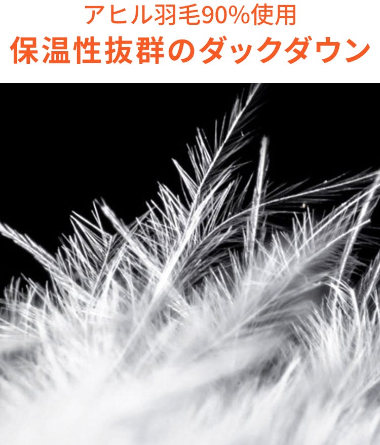 発熱ダウンの中素材には、アヒルの毛を90%使用。保温性に優れた、柔らかなダックダウンで、暖かさと抜群の着心地を実現しました。
