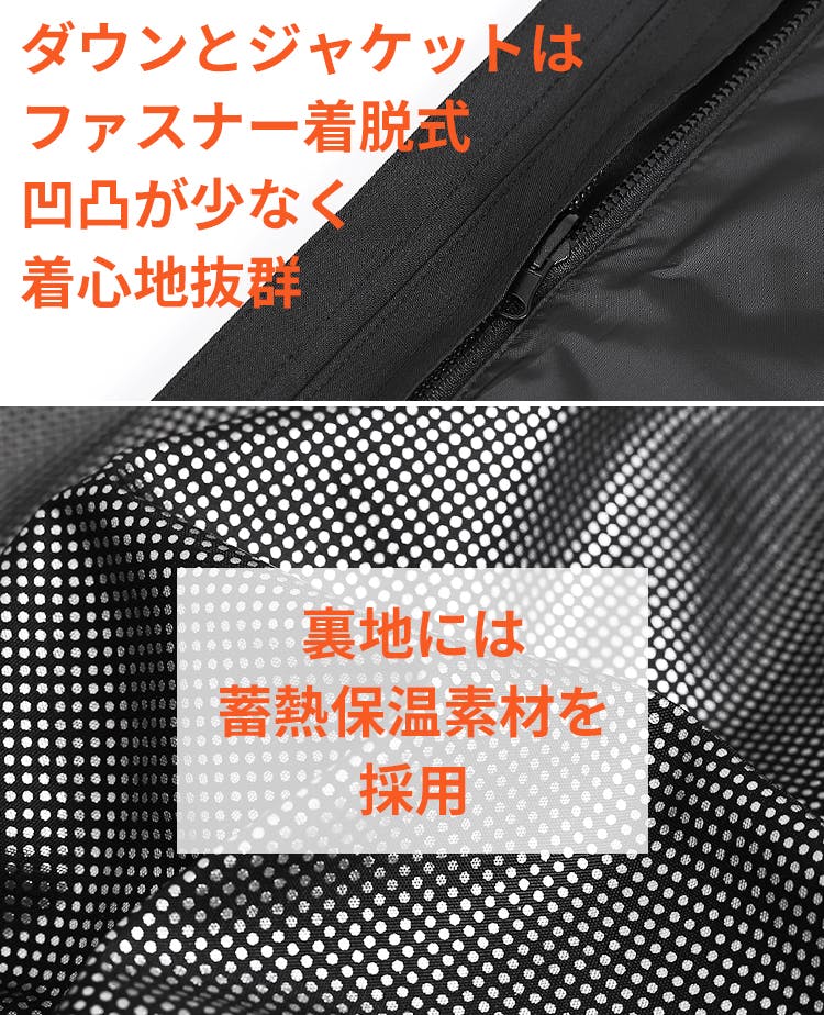 発熱ダウンに重ねるジャケットは、ファスナー着脱式。ボタン式と比べ、凹凸が少なく、着用時に違和感を与えません。