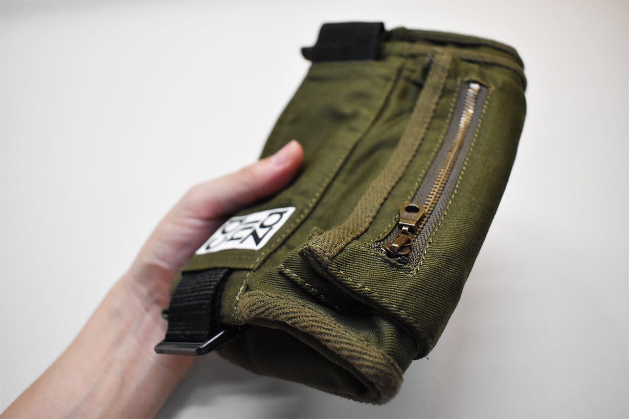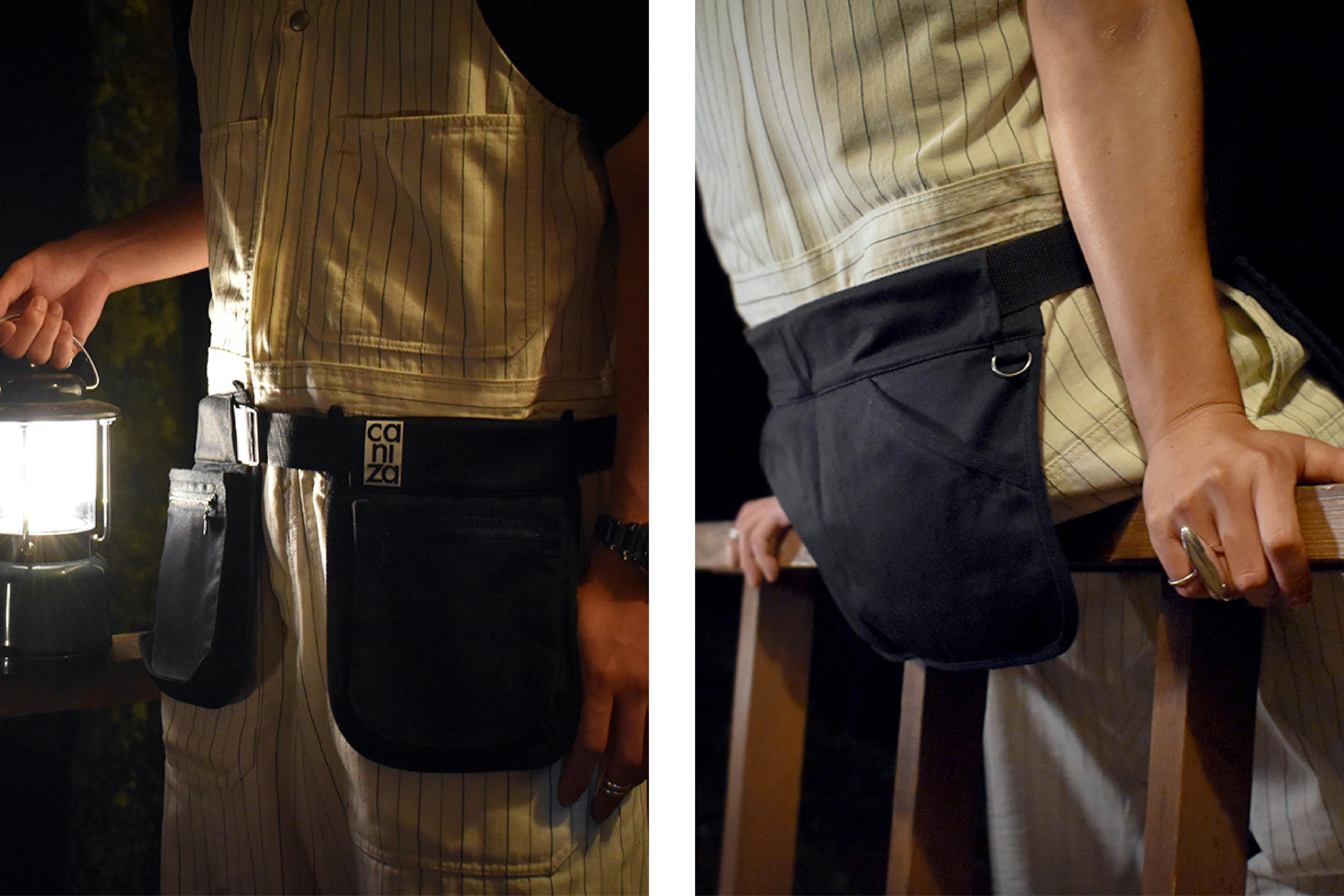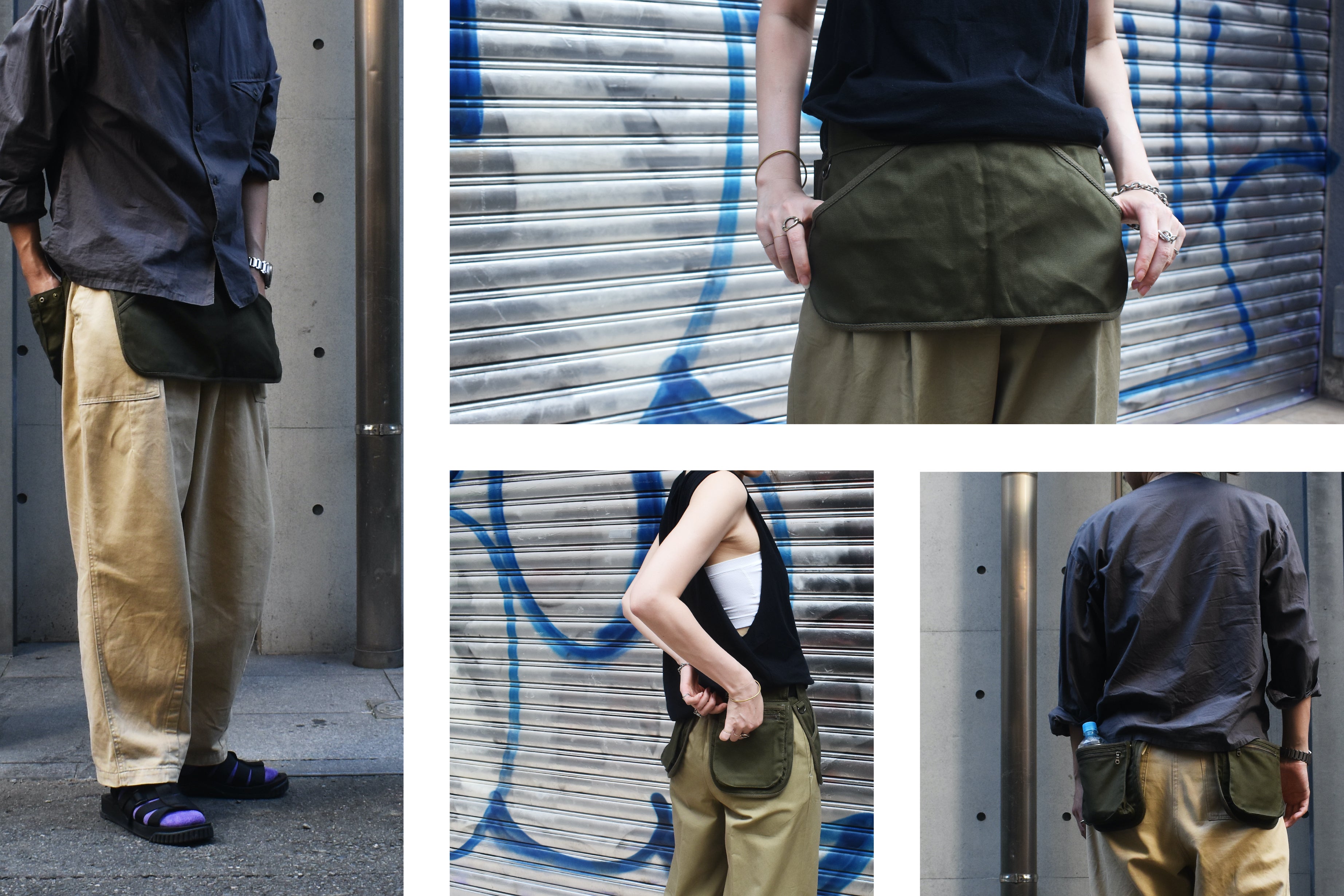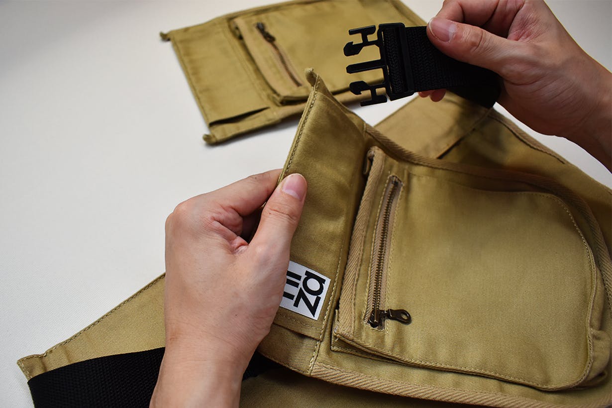 元は射撃用として使用されていたハンティングエプロンをリデザインし、日常的に使用するスマートフォンや財布などを収納するのに便利なウェアラブルマルチポケットに仕上げました。