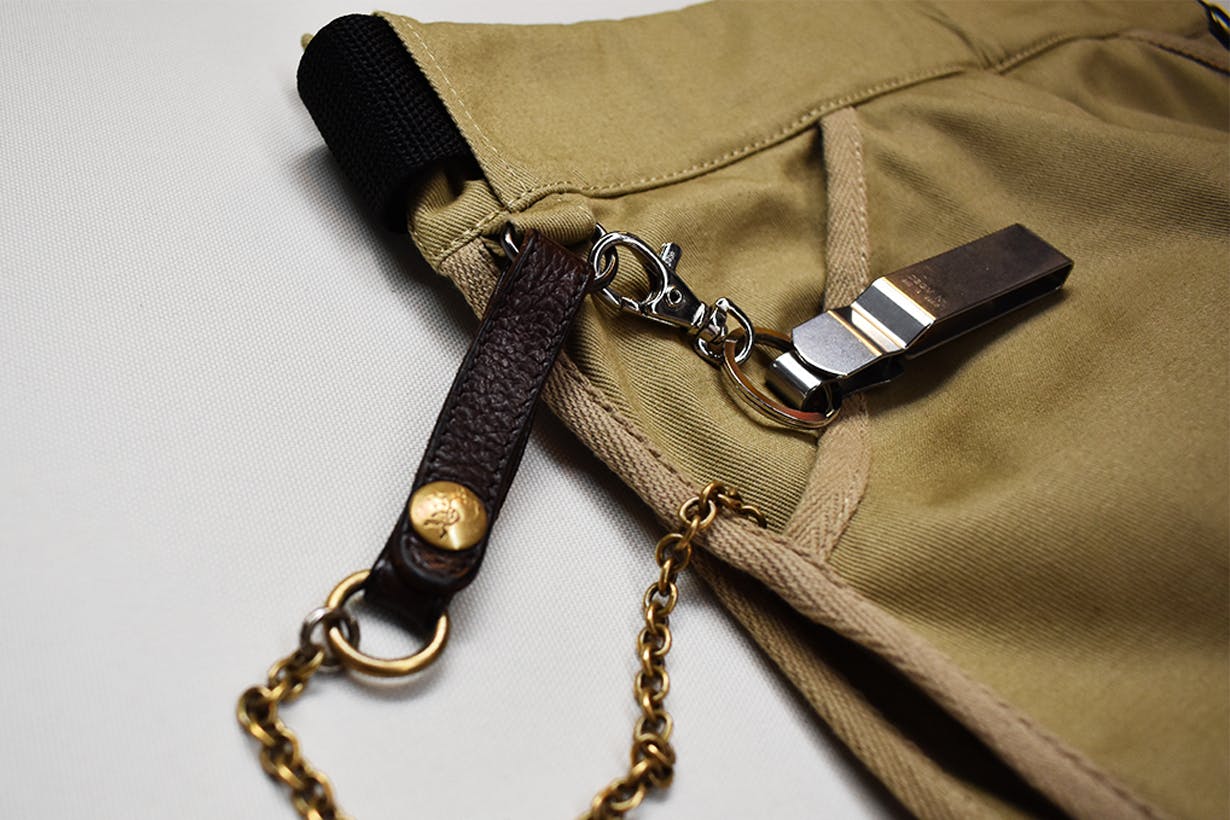 両サイドに付いている金属製のDカンにキーリングやカラビナをつけることでさらに機能を拡張することができます。