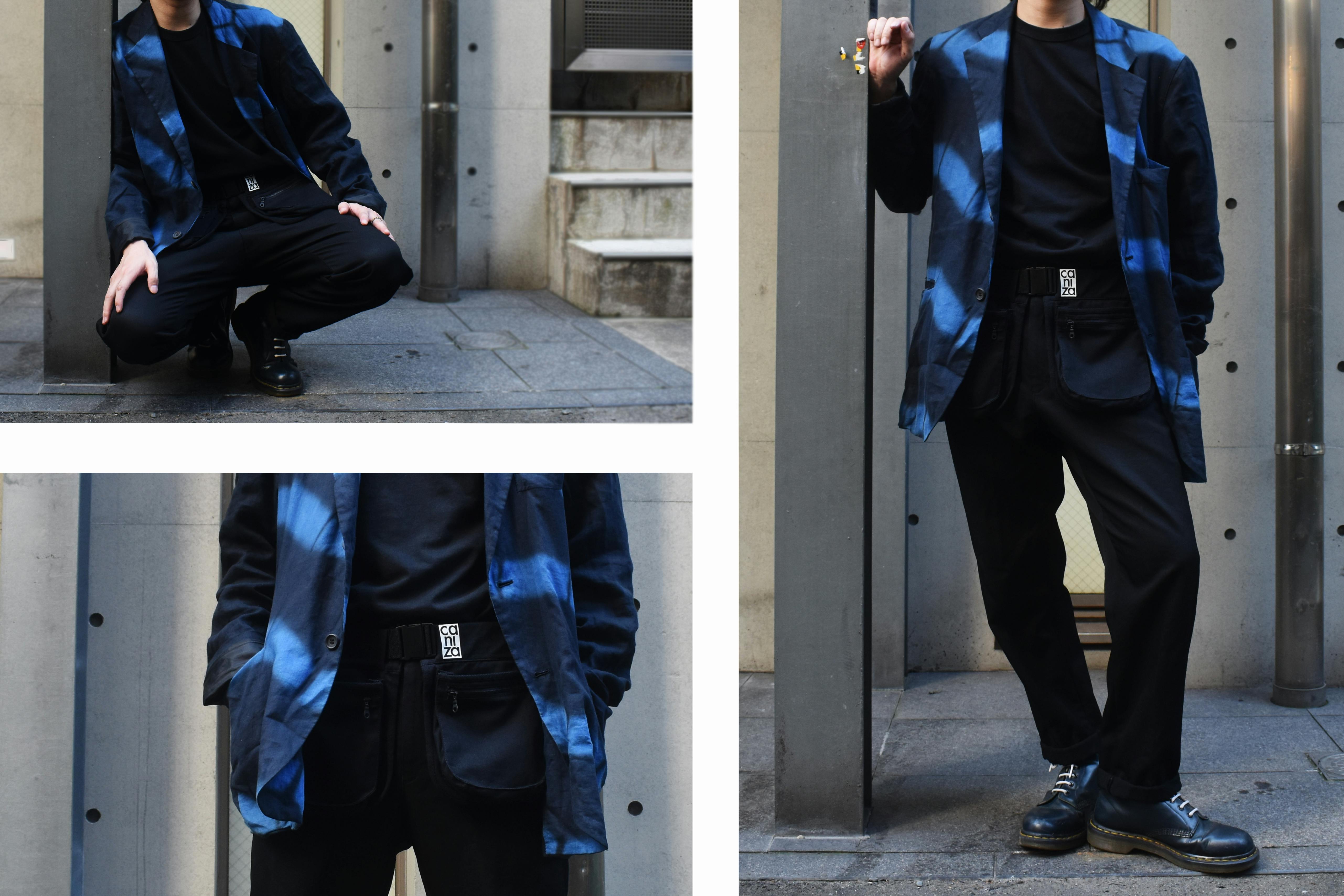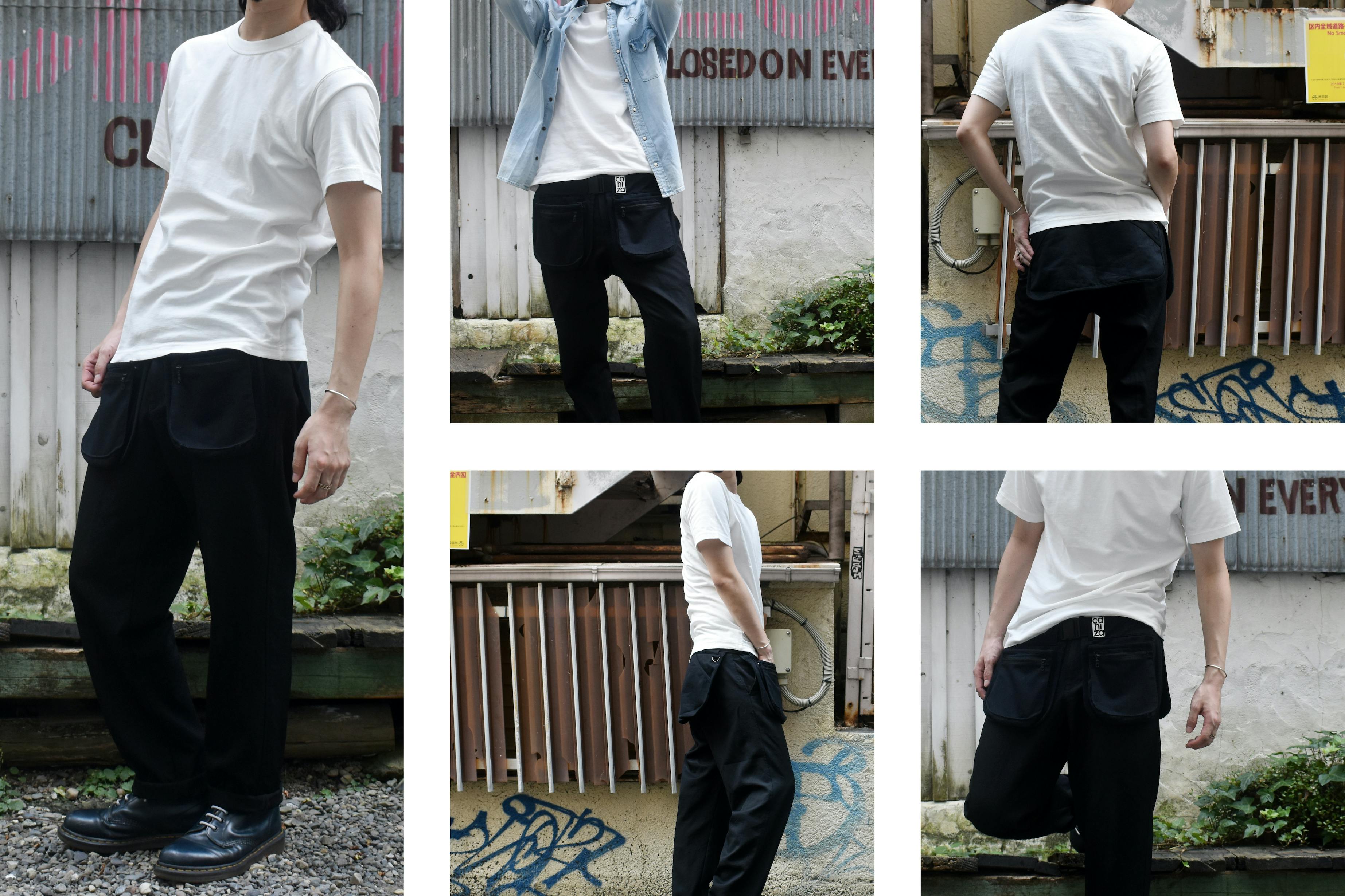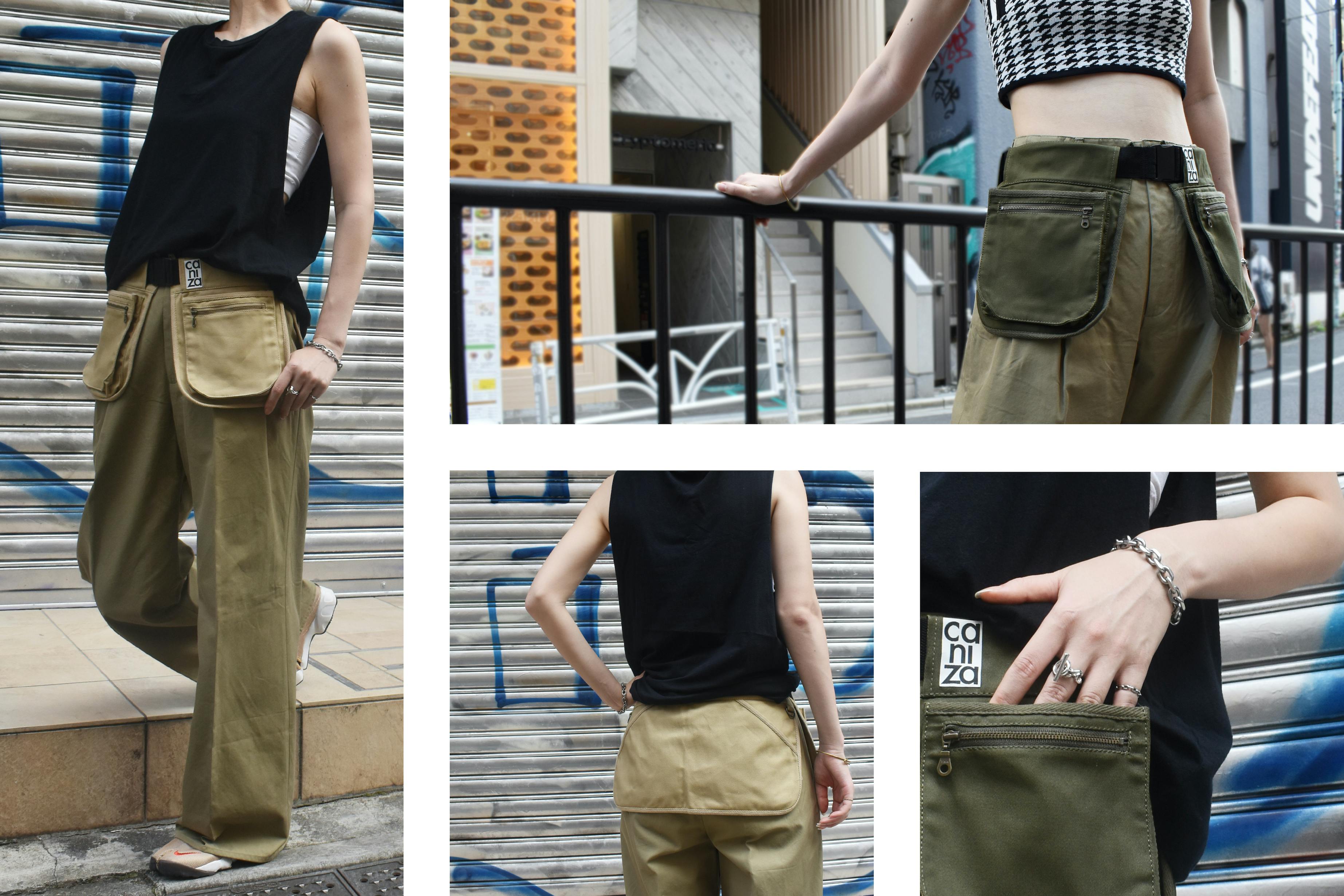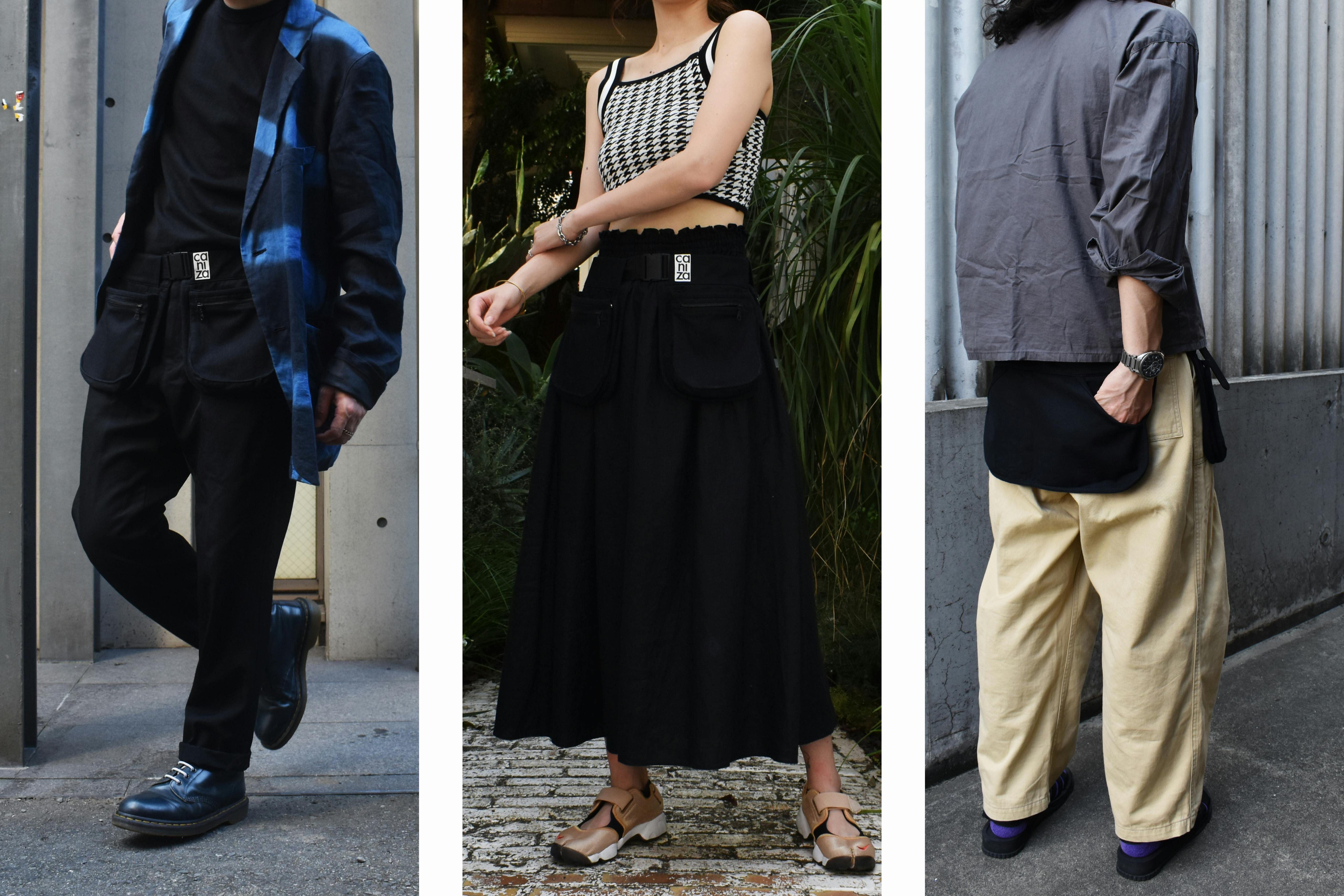 前後を入れ替えたエプロンスタイルやバックポケットをメッセンジャーバッグのように使うアレンジも。
