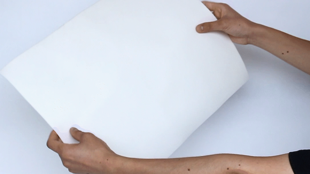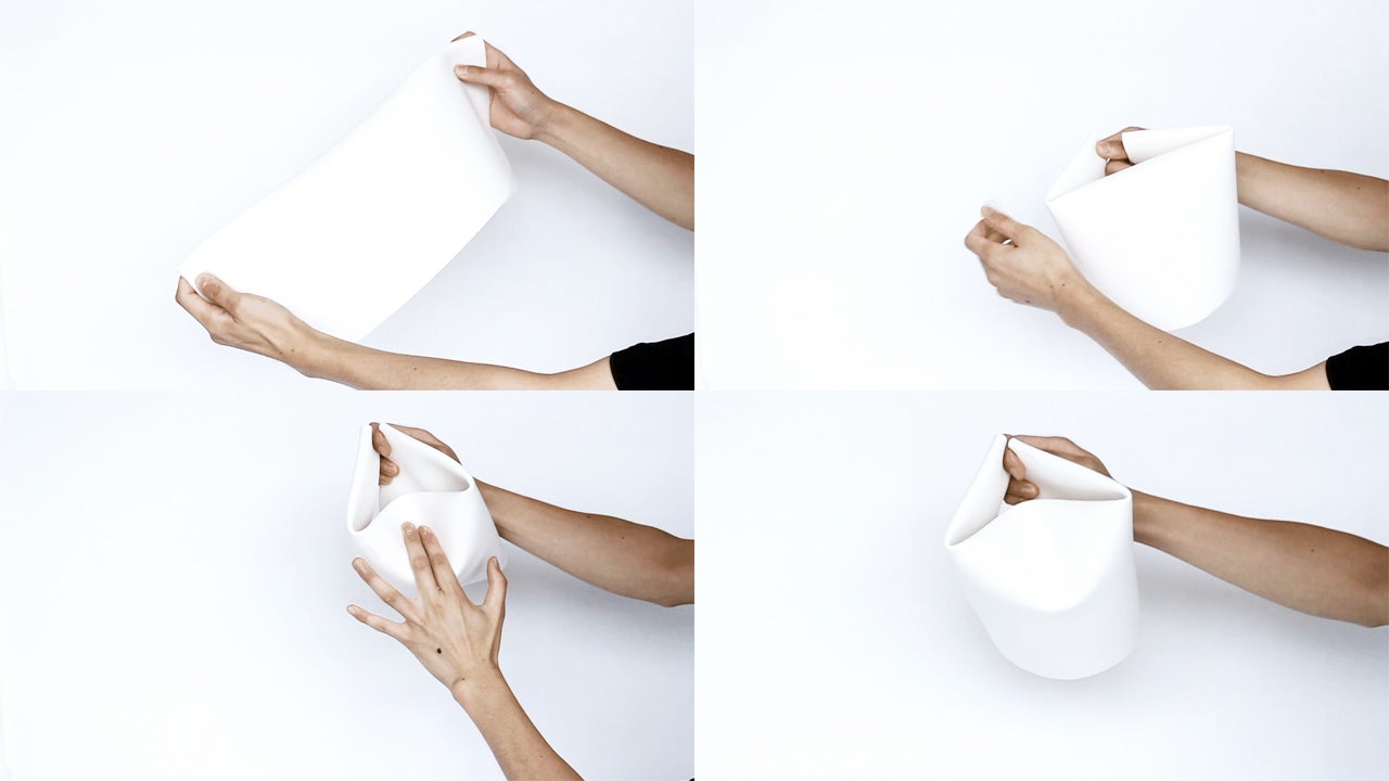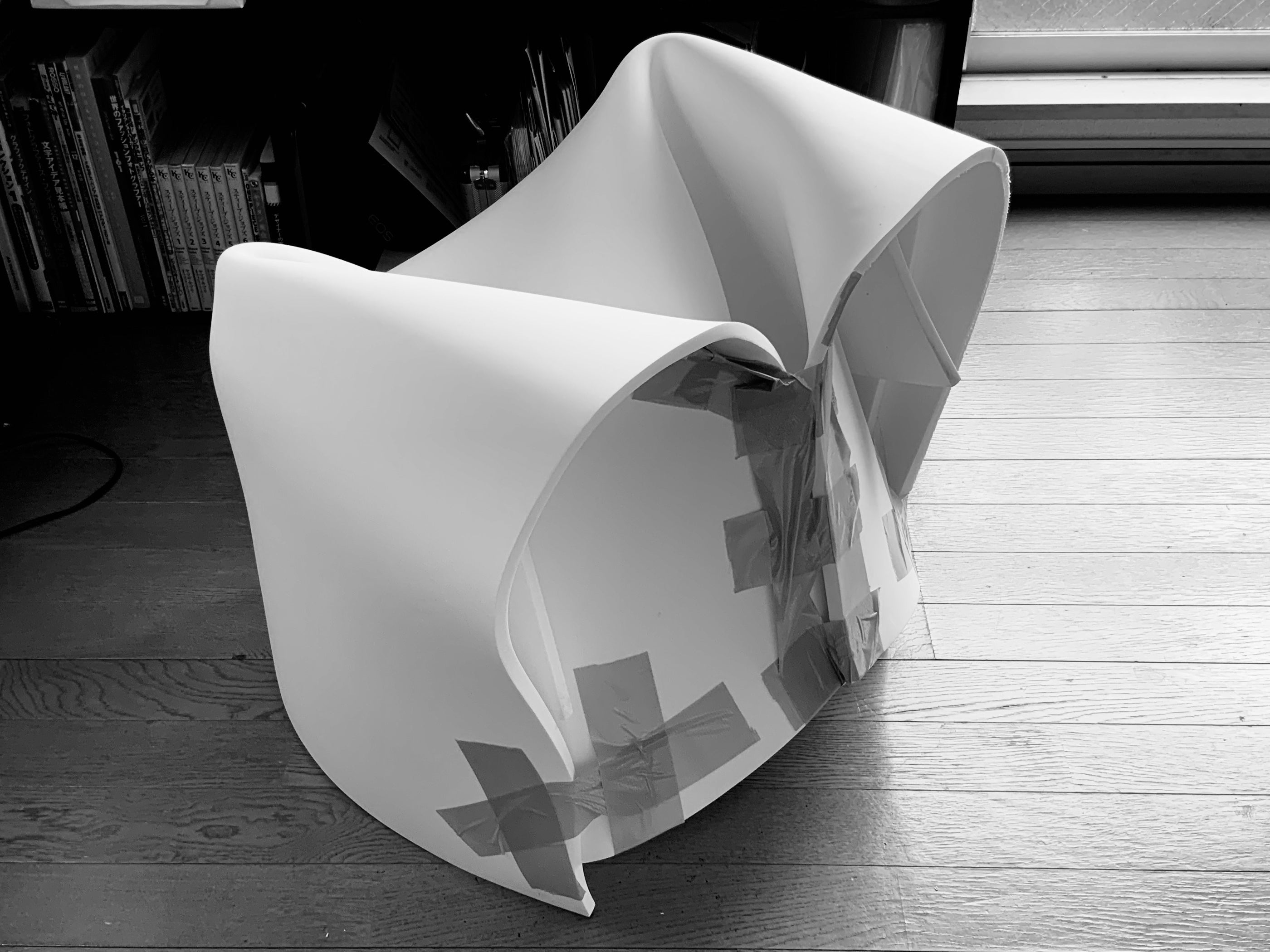 袖から着想を得て、全く新しいイスをデザイン・制作しました。シート状の発泡体だけで人を支える不思議なイスです。柔らかな造形としっとりした座り心地が特徴です。