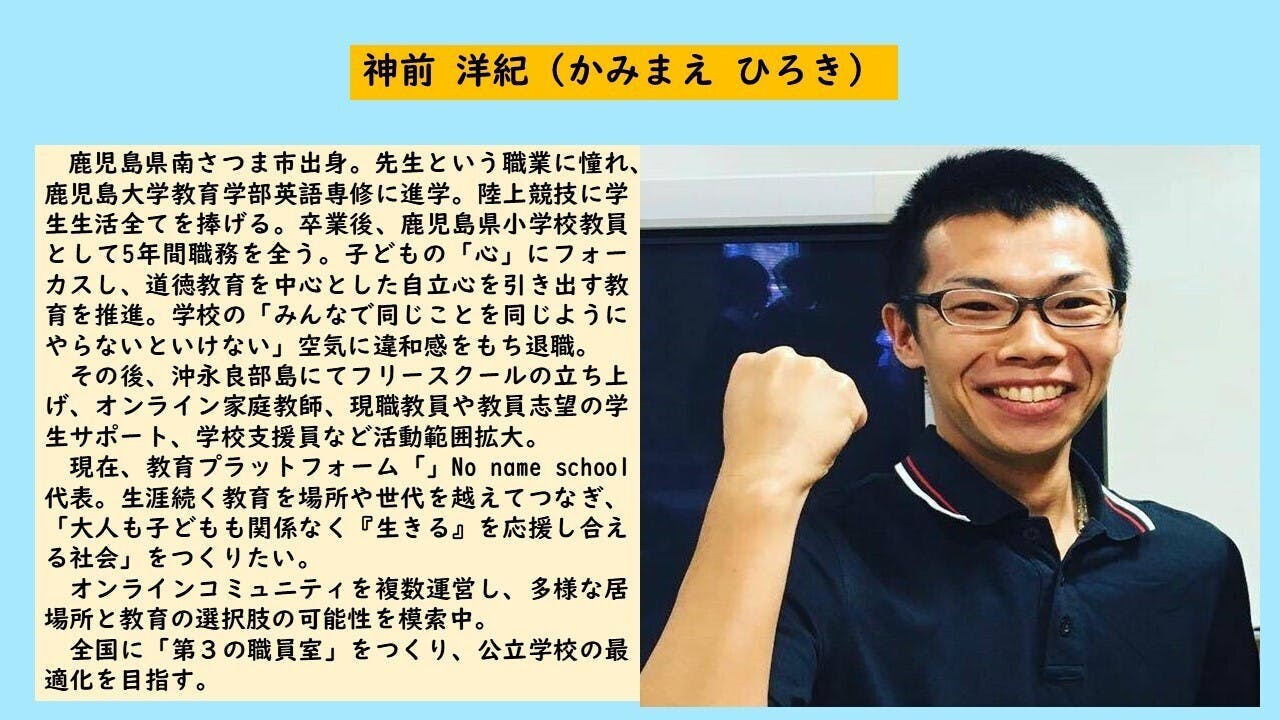 神前洋紀(「」No name school代表)。小学校教員5年(42654年)子どもや学級に応じて、言葉を巧みに使い分け、子どもの可能性を最大限に引き出し、学級崩壊も立て直す。また、フリースクールにて、発達障害児や不登校児童生徒に個に応じた教育を行う。現在、オンラインサロンNo name schoolにて、教育関係者の学び場を構築。高校生から大人までのマネジメントも行なっている。