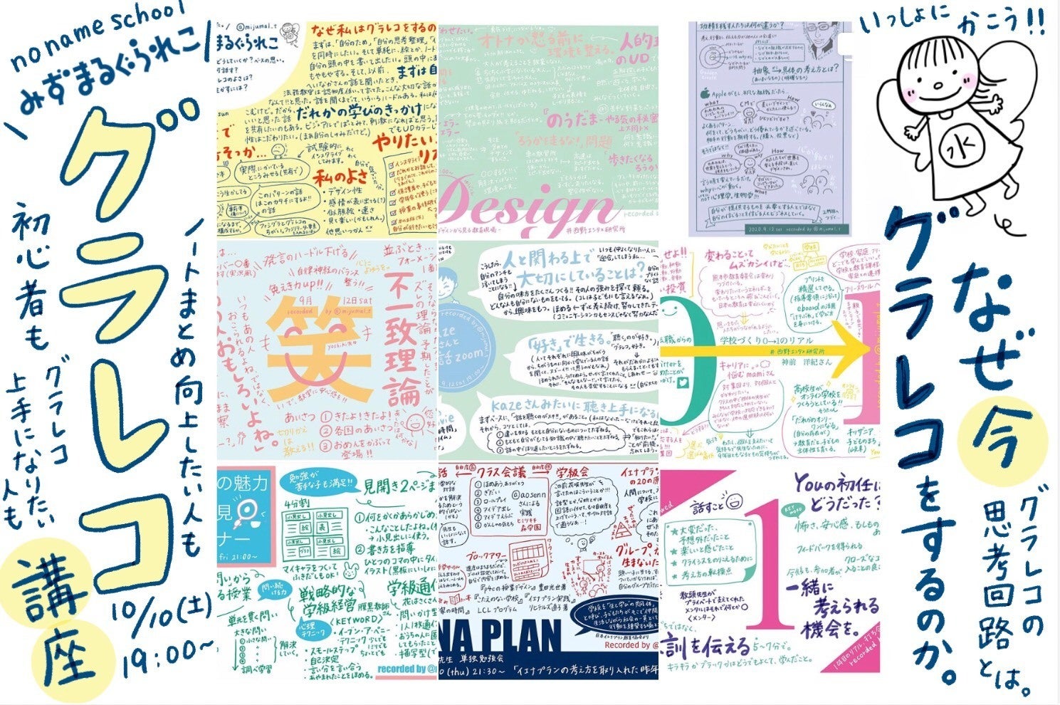 みずまる:小学校教諭。大学時代、美術科デザインゼミに所属し絵本を製作。趣味のコラージュ、ノートまとめが高じ、グラレコに繋がる。「誰かの学びのきっかけになるように」をテーマに、自身が学んだことをまとめている。