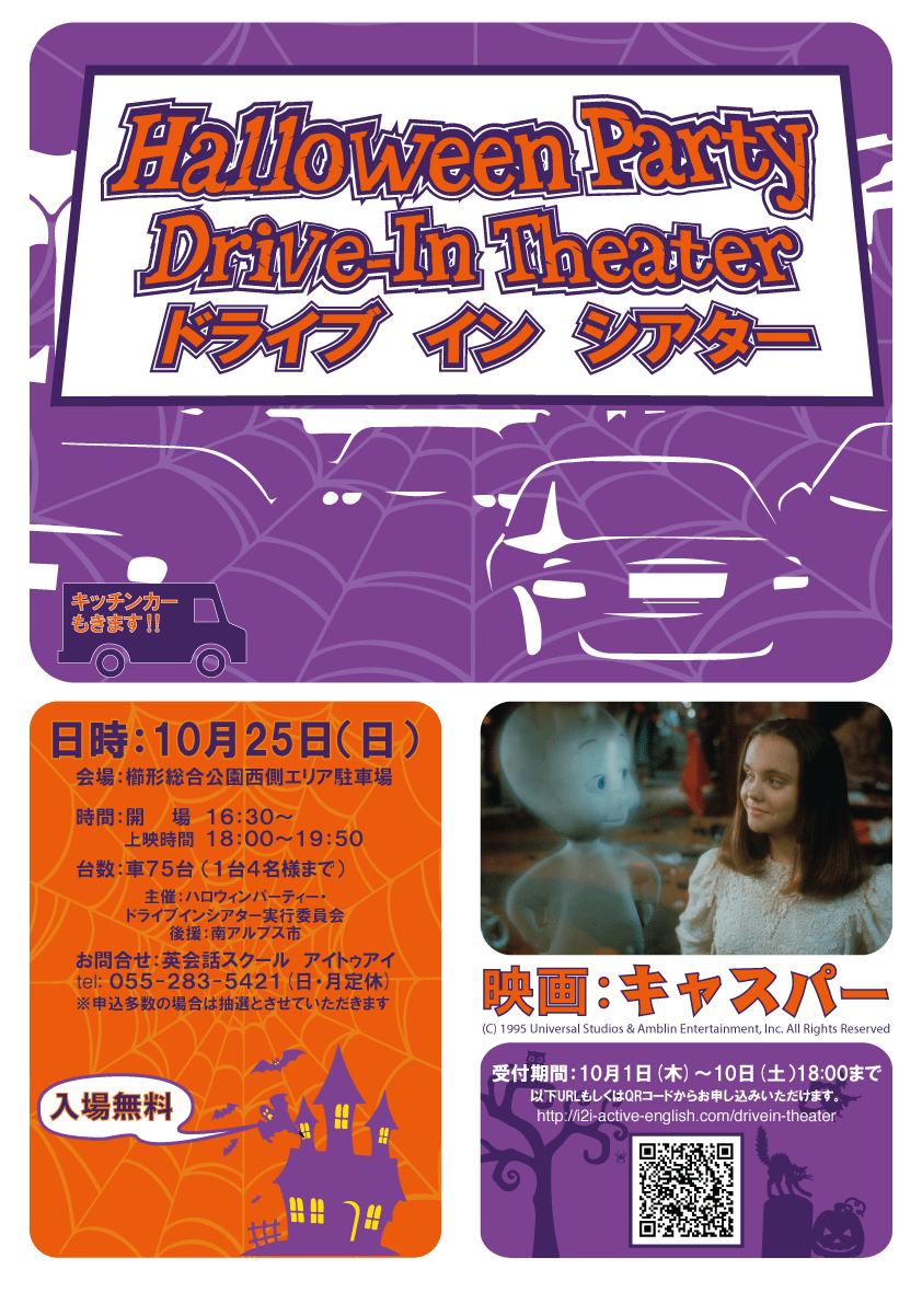 私たちハロウィンパーティ・ドライブインシアター実行委員会は、英会話スクールアイトゥアイを中心として、 南アルプス市や市民活動センターさん、塩山シネマさんにご協力いただきながら、ドライブインシアター実現に向け立ち上げられました。