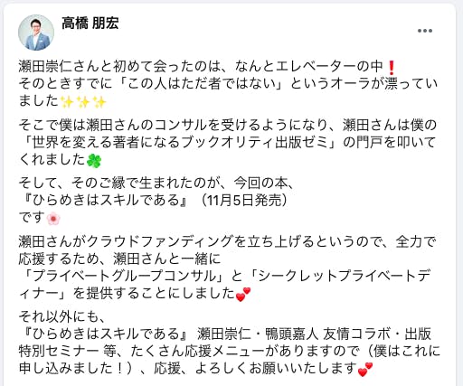 2020/10/17 18:00瀬田崇仁です。『ひらめきはスキルである』出版⭐︎お祝い祭りみなさんのおかげで、盛況です!ありがとうございます。お祭りレポート【 第2弾 】です。さて、書籍には原稿があります。< 印刷された原稿 (=ゲラ) >手元に届くと「うおぉーーー!」って感じで大興奮...これを最終チェックしてました。いよいよ、自分の手元を離れて印刷される前の最終段階。ドキドキする体験です。そして、最後の最後までやり抜くために【バイク便】をお願いしました!あと、単純に、、、やってみたかったんです。なんか、かっこよさそうで、気分が上がるから。< ドライバーさんに原稿を託す瞬間 >< 「任せてください!」のポーズ >< 颯爽と走り出す、プロの後ろ姿 >原稿を書き上げ、バイク便さんに託し、清々しい朝を迎えたのでした。出版のオファーをいただいたのは、2020/1/10 (金) 19:58はや、9ヶ月です。雨の日も風の日も、原稿を書き続けました。毎週月曜日に締め切りを設け、コンスタントにやり続ける日々。途中には、緊急事態宣言の時もありました。その時期でもオープンしていた2軒のカフェレストランがあります。そのお店でたくさん書き続け、本当にお世話になりました。リターンにランチご馳走権利が入ってるのは私なりのお店へのお返しの気持ちです。< ランチしながらの、少人数フリートーク >そして、まだまだ打ち合わせは続きます。表紙のことだったり、書店さん展開だったり。また、お祭りレポートで報告しますね!ーーーーーーーーー< お礼報告 >支援のみならず、たくさんのご紹介記事やシェアもありがとうございます。メルマガに載せてくださる方も、何人も、、、おかげで、ご縁がつながっています。< 望月俊孝さん >< 高山晴代さん >< 松井康子さん >< 三上隆之さん >< 神戸正博さん >いっぺんに全員をお載せできないのですが、広げてくださってる皆さん、本当にありがとうございます。ーーーーーーーーー引き続き、『ひらめきはスキルである』出版⭐︎祝い祭り楽しんでくださいね!では、またのお祭りレポートをお楽しみに。---------P.S.関西方面の人に向けた、追加屋台(リターン)が出来ました!リッツ・カールトン大阪でのアフターヌーンティーイベントです。ラグジュアリーな空間。だけでなく、このホテルは思い出の場所です。なぜなら、、、奥さんにプロポーズした場所だから。そんな場所でお会いできる方、楽しい時間をご一緒しましょう。 もっと見る