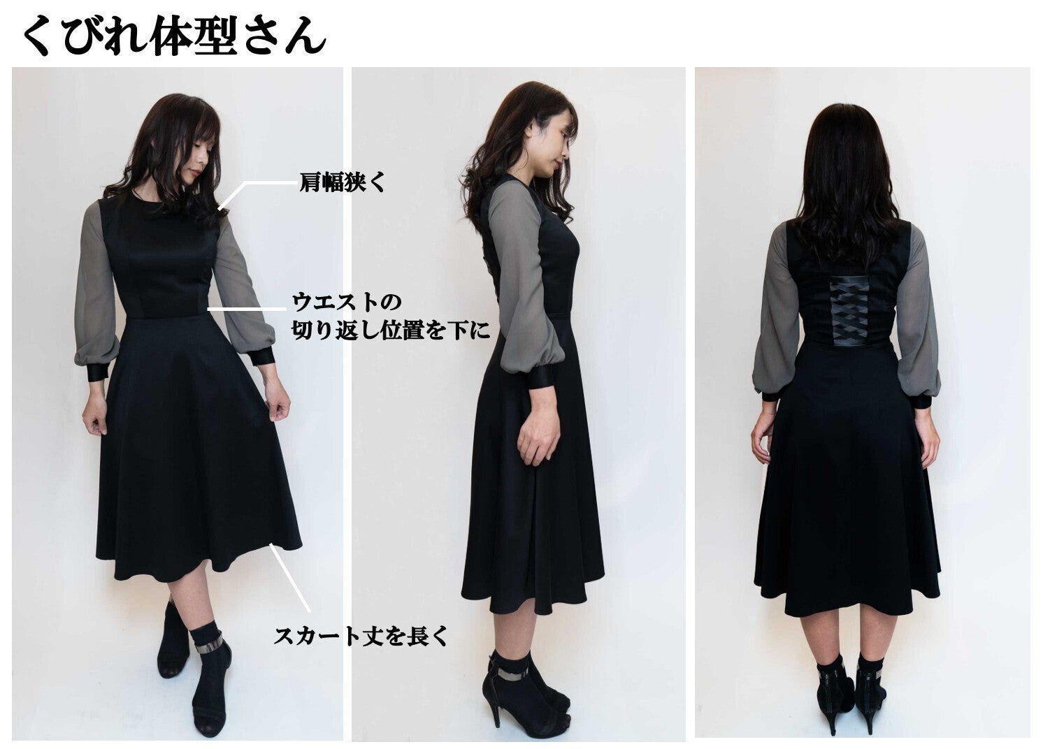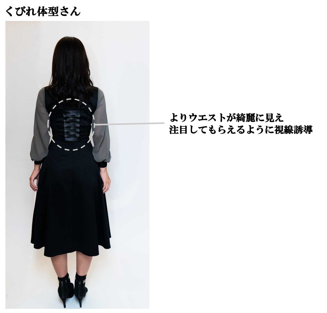 くびれ体型さんは、バックスタイルの腰部分に編み上げのデザインを入れることによってウエストが綺麗なくびれ体型さんのウエストがより綺麗に見え注目してもらえるように視線誘導を使用しました。