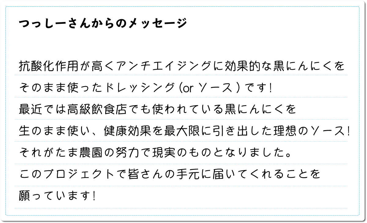 ただ、今回のことで縮こまってしまうのではなく、むしろステップアップしたいと考え、その第一弾として多くの方の力を借りて「黒にんにくトマトソース(仮)」のクラウドファンディングをスタートいたしました。