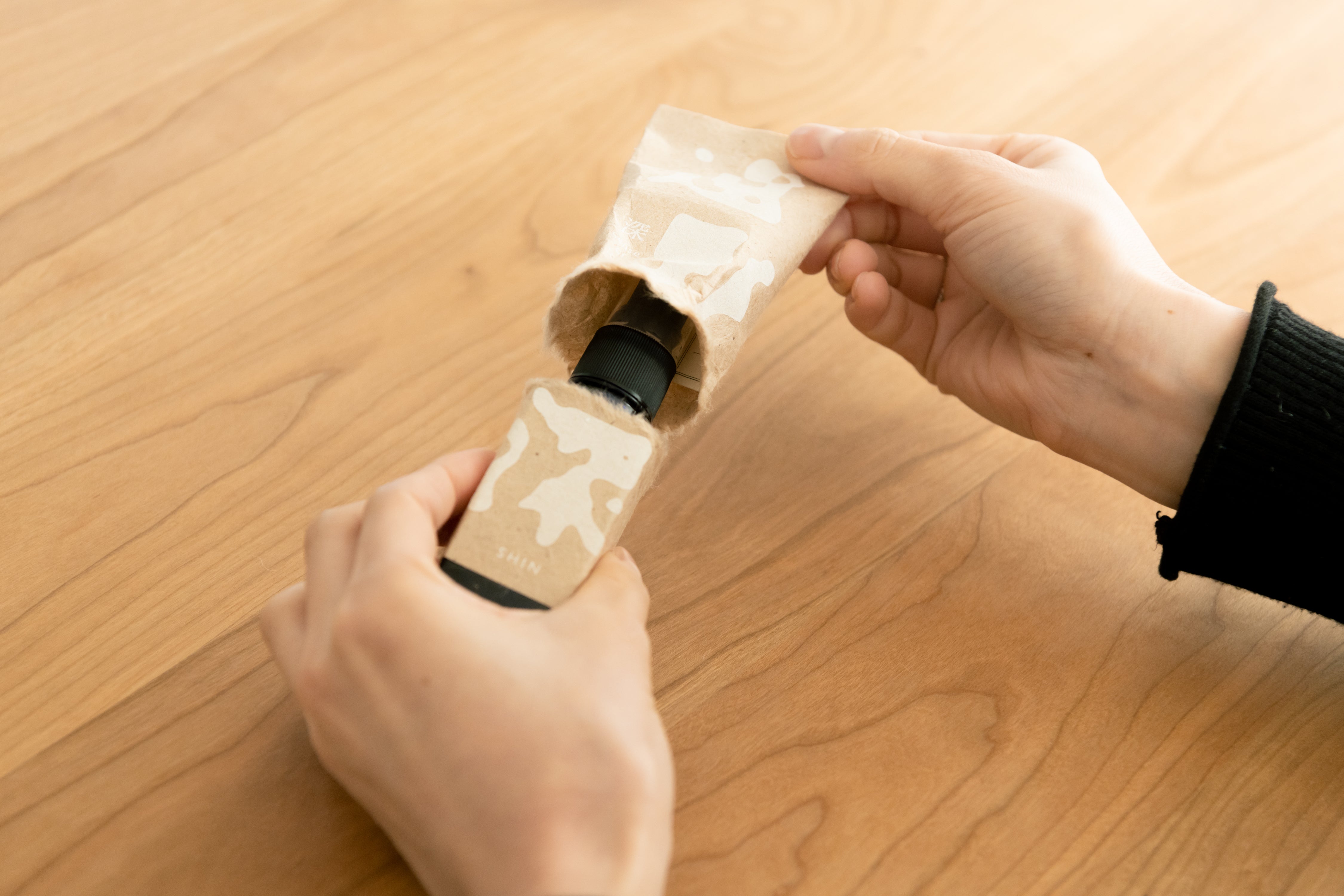 当初は視覚表現に対しコンセプトを詰めていきました。土地の意識を閉じ込める商品であるため漏れないよう大切に「封」をする、という部分から発想を広げ、さらに遠野産ホップ和紙の触覚効果を活かすため「封を破る」という禁じられた動作体験を伴わせることにたどり着きました。封をすることと、封を破ることどちらにも強い負荷を生み出せれば、それは遠野の土地の印象や記憶と結びつき、どこにもない体験に生まれ変わるのではと。オシラ様や蚕などの遠野ならではの強いストーリーをイメージソースとし形状のデザインへ反映させています。視覚的な表現は、さまざまな方向性からアイデアを出したものの最終的に霧深い遠野をぼんやりと感じる状態を表現したタイポグラフィーをメインとしました。ムラや厚み、透け感、皴のある生き物のような素材の魅力をどう引き出しどう活かすか、印刷加工へも注力しました。大量生産では味わえない一つ一つの違いを嗅覚・触覚・視覚をフル活用し是非楽しんでいただきたいです。