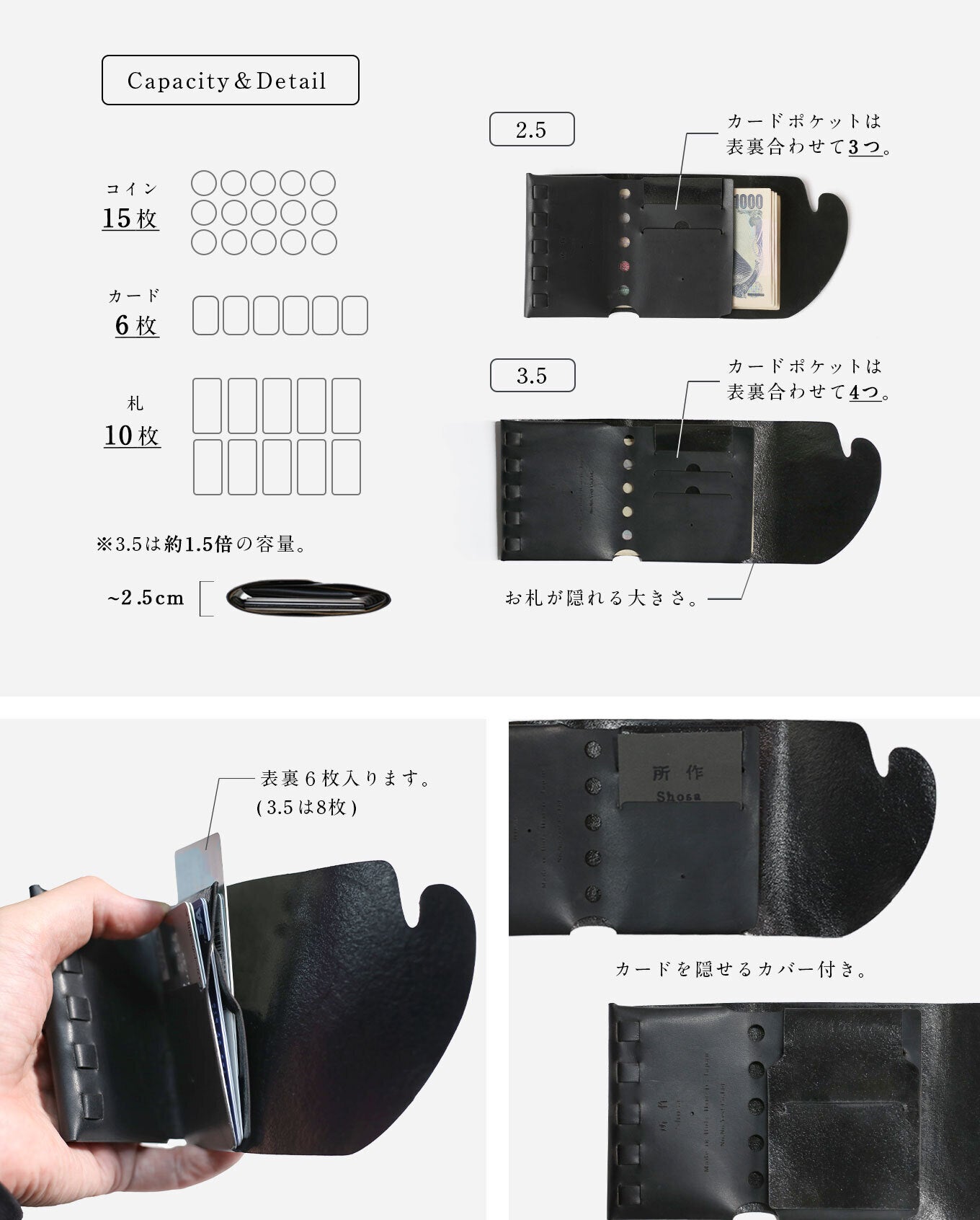 ※サイズ3.5(2サイズの大きい方)はお札が隠れて収納でき、2.5の約1.5倍の容量をカバーできます