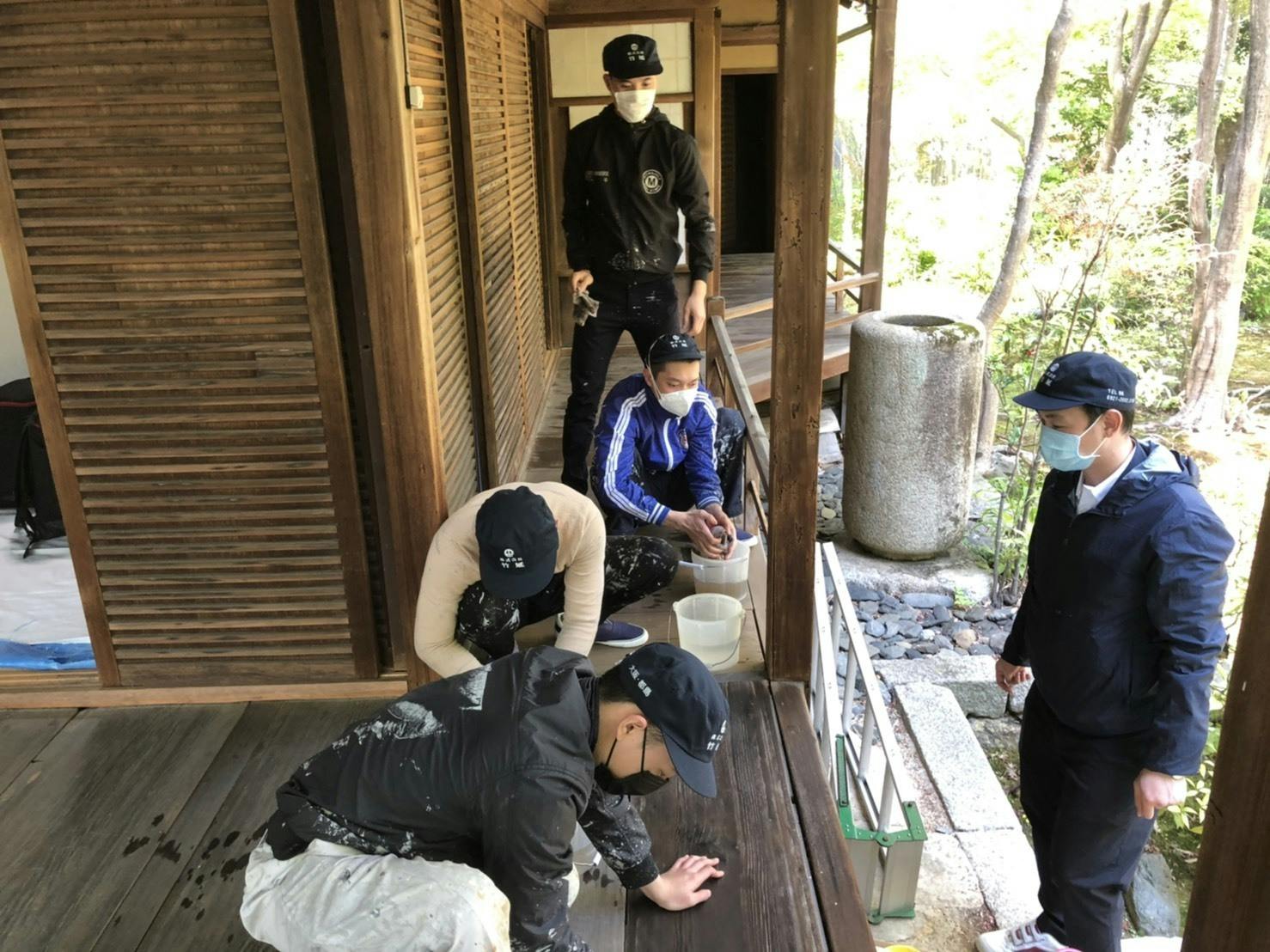 将来を担う若手職人は、伝統建築を修復するとともに、当社が培った建築技術、左官や塗装の技能をベテラン職人から手取り足取り学べます。