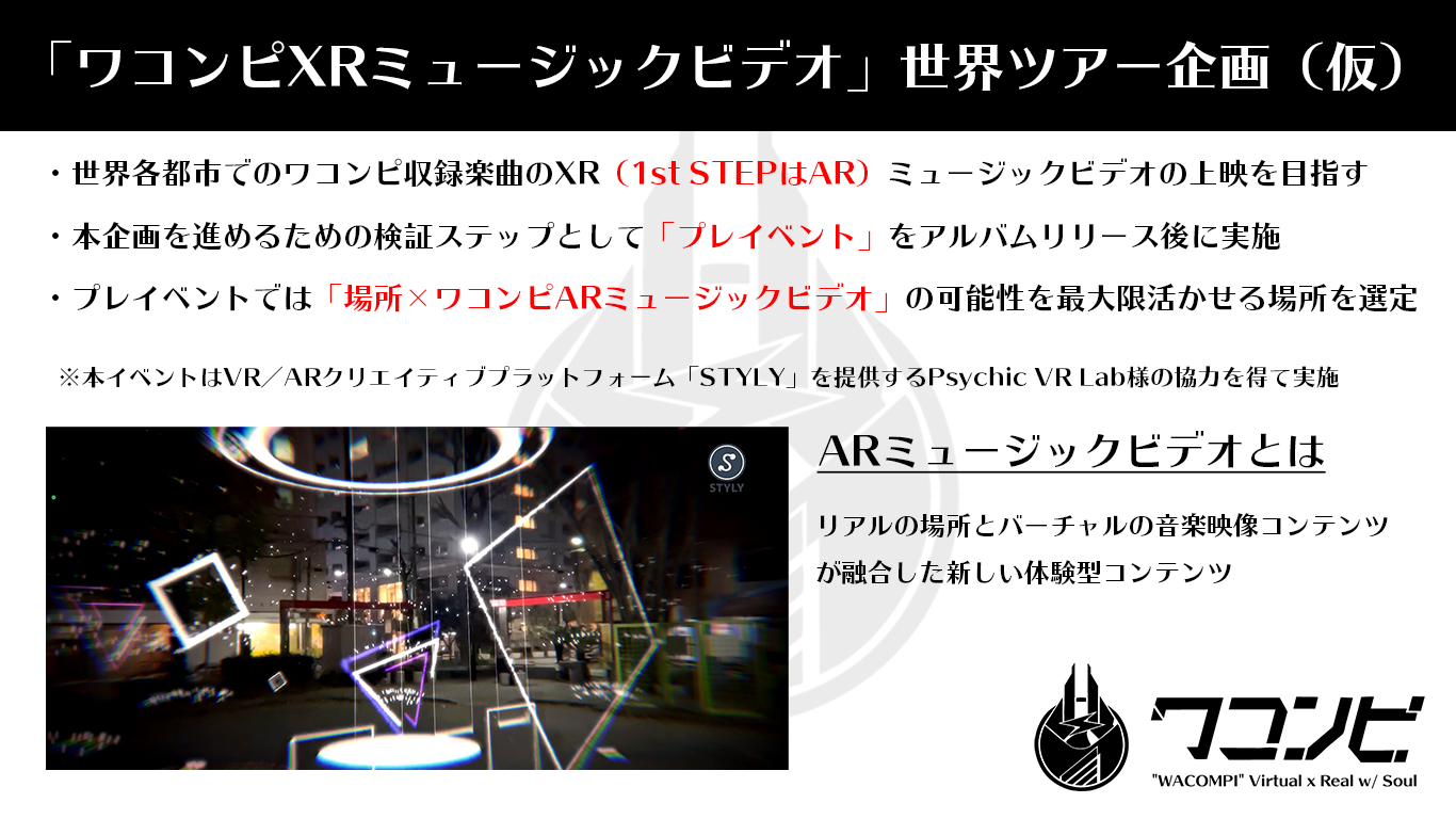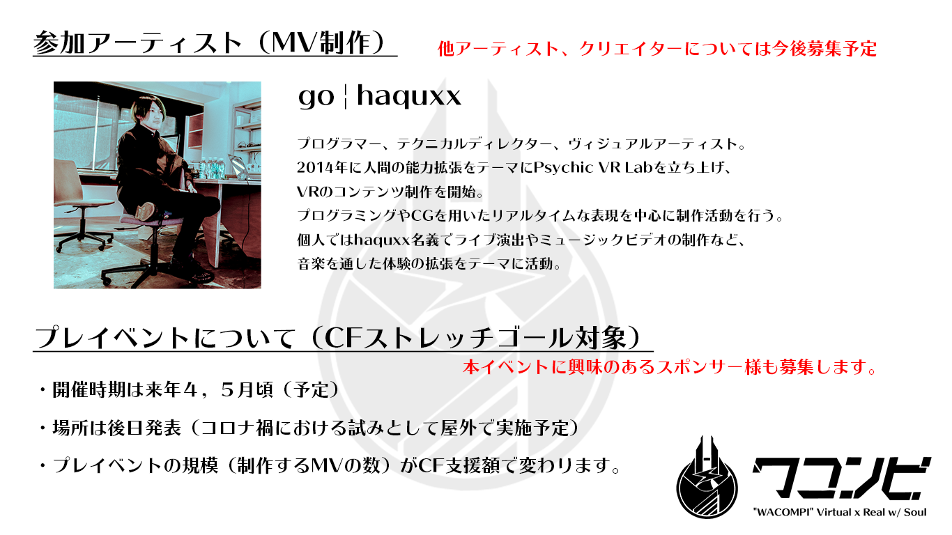 以下の新企画「ワコンピXRミュージックビデオ」世界ツアー(仮)の検証ステップとしてプレイベントを開催することになりました。そのプレイベントの規模(制作するMVの数)が支援額(ゴール設定はしておりません)で変わります。リアルとバーチャルを繋げる新たなチャレンジについても応援よろしくお願いします