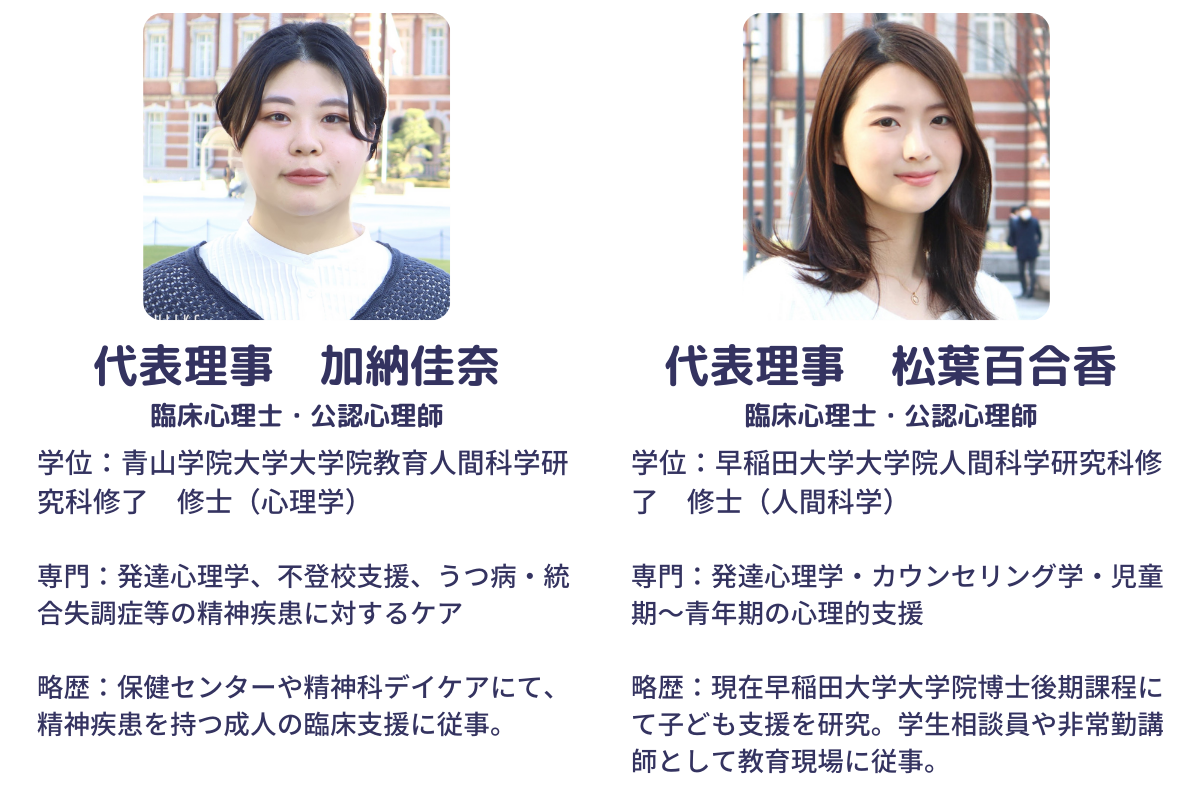 松葉さん、加納さんのお二人はそれぞれ別のご専門の分野で、臨床心理士・公認心理師としてご活躍された経験があるので、教育、医療の両面から子どもたちのサポートができるのがだーちゃさんの最大の強みだと思います!今後も多くの子どもたちの支えの場になっていくことと思います!どうぞ皆様お力添えのほど、よろしくお願いします!