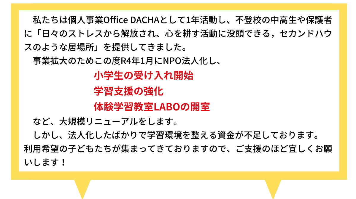 前回、フリースクール開校に向けたクラウドファンディングでも記載いたしました。