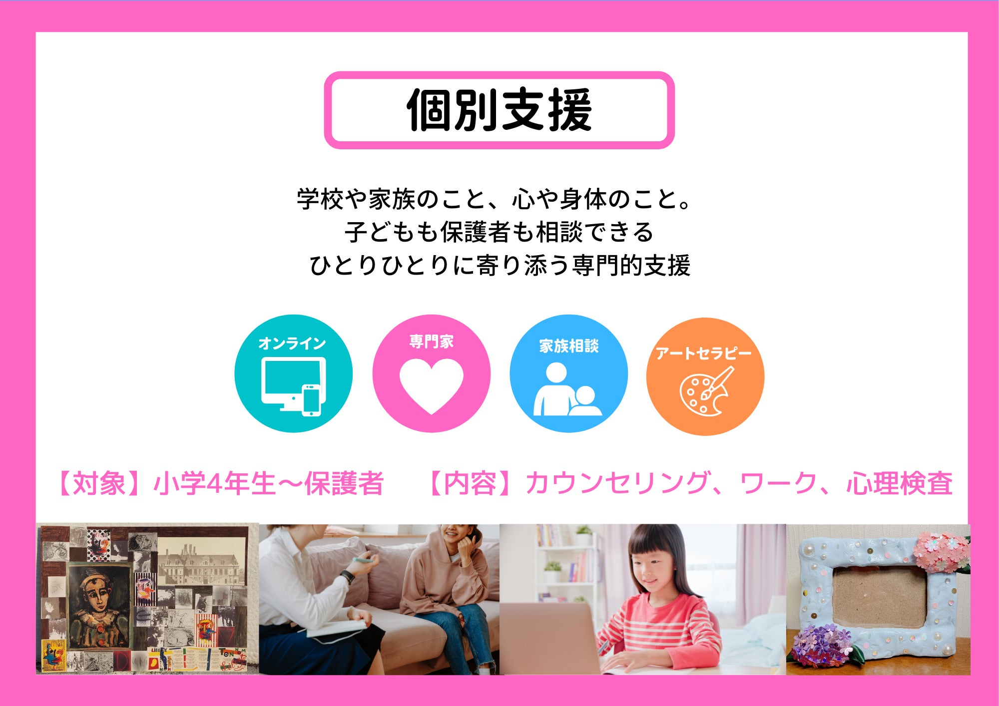 私たち特定非営利活動法人だーちゃらぼは、臨床心理士、公認心理師の資格を所持しているスタッフが、利用者1人1人のニーズとこころに寄り添った支援を行っている団体です。