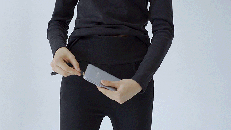 パンツの右ポケットにあるケーブルからモバイルバッテリーで給電することによって、放熱シートは発熱を開始します。モバイルバッテリーを繫いでから、放熱シートが熱を発するまでの時間はたったの1秒!1秒たりとも“冷え”をお腹に感じさせません。
